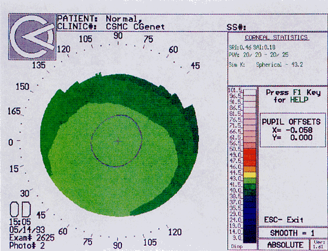 When the three targets overlap, maximum focus has been reached and an electronic snapshot of the video picture of the reflection of the Placido mires is taken. The computer analyzes the image to determine the size and shape of the mires; it reconstructs the patient's corneal surface and presents a graphic picture of the patient's topography in a suitable form. The most useful form of data presentation is a color-coded corneal contour map in which steep areas are depicted as “hot colors,” such as reds and browns, and shallow areas as “cool colors,” such as blues and greens (Fig. 6). Two scales are commonly used: absolute and normalized. In the absolute scale, each color represents a 1.5-diopter interval between 35 and 50 diopters, whereas above and below this range, colors represent 5-diopter intervals. This scale is useful in routine practice (e.g., preoperative screening). In the normalized scale, the cornea is divided into 11 equal colors spanning that eye's total dioptric power. In this scale, more minute topographic details within an individual cornea are appreciated.8,9 An isometric plot is also available in which the cornea is viewed side on, allowing the observer to appreciate the relative depth of a corneal incision. As part of the topographic display, quantitative indices are also generated, including the following: predicted visual acuity based on corneal shape, simulated keratometry readings, minimum keratometry reading, surface regularity index, and surface asymmetry index.10 |