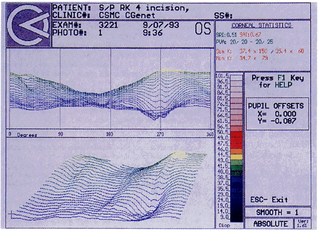 Videokeratography studies have provided evidence to suggest a genetic basis for keratoconus. In one study,31 we found that 50% of family members of patients with keratoconus had subtle topographic findings similar to that seen in clinically obvious keratoconus. In a subsequent study,32 using videokeratography as an aid to construct family pedigrees, we demonstrated an autosomal-dominant mode of heredity (Fig. 16). Future investigations of suitable family pedigrees for genetic linkage analysis may provide pointers to the pathogenesis of this disease at a molecular level.32 PENETRATING KERATOPLASTY Videokeratography has several clinical applications for penetrating keratoplasty. First, in planning surgical treatment for keratoconus, the extent of the ectasia can be mapped out. Second, if pellucid marginal degeneration is detected in a patient suspected of having keratoconus, the surgeon might want to consider embarking on a lamellar procedure before considering a full-thickness keratoplasty. Postoperatively, the degree of astigmatism can be monitored. In patients who have continuous running sutures, videokeratography can aid the clinician in adjusting the running suture to decrease the amount of astigmatism. In patients who have interrupted sutures as part of their procedure, videokeratography can delineate which sutures are tight and should be removed during selective suture removal.33–35 Finally, videokeratographs can assist the surgeon in planning for astigmatic keratotomy in patients who have large degrees of postpenetrating keratoplasty astigmatism. Whereas keratometry might suggest that T cuts should be placed 180° apart, videokeratography often demonstrates that the steep axes are nonorthogonal, influencing the surgeon to place the T cuts in the steepest areas, which might be separated by angles of less than 180°. A recent study of patients with postpenetrating keratoplasty astigmatism showed that the results of astigmatic keratotomy combined with compression sutures using videokeratography as a guide are superior to the results of studies in which either keratometry or photokeratoscopy alone were used as a guide.36 RADIAL KERATOTOMY Videokeratography in radial keratotomy has gained increased utility in the following areas: screening before surgery, planning for surgery, monitoring corneal changes after surgery, explaining untoward effects of surgery, and managing complications.37–41 As previously discussed, preoperative screening of candidates for radial keratotomy is useful to rule out early forms of corneal ectasia not detectable by clinical means and also holds promise for predicting the outcome of surgery based on corneal shape. Previous studies suggest that corneal shape might be a predictor of the response to radial keratotomy. Videokeratography is extremely useful for planning astigmatic surgery in conjunction with radial keratotomy. The topographic pattern is useful for deciding the placement and length of the astigmatic cuts; the pattern and location of the astigmatism may also dictate the orientation of the radial cuts. Color-coded maps might also be useful in planning repeat surgery in patients with a response to surgery that has been less than optimal. A wire mesh profile in the new Topographic Modeling System software demonstrates the location and depth of the cuts. Cuts that have not been made deep enough for maximal effect can be identified and redeepened for additional effect (Fig. 17).