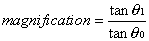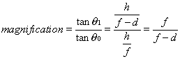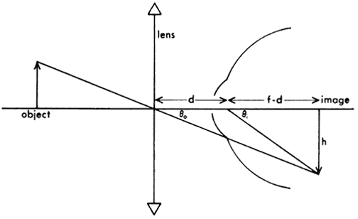 With the lens in position, the eye sees the image of height h, formed at the focal length of the lens. Thus, the image is formed at distance f from the lens and enters the entrance pupil at angle ξi. Without the lens in position, the “image” is the object itself, located at optic infinity. Because all light rays from a point on an object at infinity are parallel, the angular characteristics of any ray can be examined. Consider the light ray extending from the top of the object through the optic center of the lens. This ray passes through the top of the image as well, because light passing through the optic center of a lens is undeviated. This light ray from the object intersects the horizontal at an angle of ξo. (Because light rays from the top of the object are parallel, they all enter the eye at the same angle, and it is therefore legitimate and appropriate to consider this angle ξo.) The image magnification induced by this lens is therefore the ratio of the angles ξi/ξo. For small angles, the approximation ξ = tan ξ is valid. If ξi and ξo are considered to be sufficiently small, then