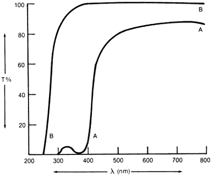 optic transmission characteristics. LENS SHAPE The dioptric power of a lens depends on its front and back curves (and its thickness). However, other aspects of the quality of the image formed may also be influenced by judicious selection of these parameters in IOL design and production. It has been suggested that spheric aberration may be reduced by implanting a planoconvex lens with the plano side anterior because of decreased lateral spheric aberration.168–170 (Shearing, however, could not distinguish any effective difference in the visual status between having the plano or the convex surface forward.103) Other workers, studying lens design with mathematic calculations, have concluded that a planoconvex IOL (with the plano side an-terior) most closely approximates the theoretic spheric aberration of the Gullstrand eye (although it is not the lens shape that provides the least spheric aberration.)171 Using a different mathematic approach, another group concluded that the spheric aberration of an IOL cannot be made 0, only minimized.172 They believed that the optimal lens shape was almost convexoplano, with the more curved surface anterior. The spheric aberration of an IOL is potentially less than the aberration from the cornea. Taking into account corneal asphericities, on-axis performance of centered IOLs was optimized with shapes near convexoplano, or biconvex, with the more curved surface anterior.173 Investigators have used computer ray tracings to study IOLs of various shapes.174 They concluded that spheric aberration could be almost completely eliminated with an asymmetric biconvex IOL, with the stronger curvature facing the retina. More total refractive power is needed, of course, when the curvature of the IOL is stronger on the side facing the retina, owing to changes in the position of the principal planes. As the position of the IOL in the eye is moved more posteriorly, the theoretical IOL that produces no spheric aberration changes. As the lens moves posteriorly, the ratio of the curves of the two sides (stronger curvature facing the retina) decreases.174 Others have suggested that the ideal IOL should be located in the posterior chamber with biconvex spheric curves, the posterior curve is approximately three times steeper than the anterior.175 They also point out that a biconvex lens would have fewer reflections from the lens surface than a lens with one plano surface would. Use of aspheric curves on IOLs has also been suggested to minimize spheric aberration, particularly in patients with a more dilated pupil.171 Conversely, it has been suggested that a biconvex spheric lens might suffer less image degradation from decentration than a lens with aspheric optics.175 A biconvex lens may provide more refractive power, thus allowing for a thinner lens and more lens-iris clearance.176 It has not been demonstrated, however, that there is any clinical significance to spheric aberration in IOL design, nor is there any conclusive clinical evidence that any particular lens design is optically superior. In eyes filled with silicone oil, the back surface of the IOL has a reduced refractive effect as a result of the different index of refraction of silicone oil.177 These silicone-filled eyes became hyperopic because of the decreased light convergence at the posterior side of the IOL. Meniscus and convexoplano lenses had the least error, biconvex and planoconvex the greatest. The least hyperopic shift is seen with meniscus IOLs.72 Similarly, it has been suggested that convexoplano lenses should be used in patients with diabetes who might need future vitreoretinal surgery.178 During fluid-gas exchange procedures, an eye with a biconvex IOL behaves like a phakic eye and frequently requires a high minus contact lens for visualization of the retina, with consequent minification and reduced stereopsis. With a plano surface posteriorly, minimal changes in the refractive power occur at the lens surface when air or silicone oil fills the vitreous cavity. Therefore, a vitreoretinal surgeon can use standard vitrectomy contact lenses, including prism lenses, for visualization of the fundus in a gas-filled eye with a convexoplano IOL. Analysis of an optimal IOL design is difficult. One of the problems is determining just which factors are important in obtaining the optimal image. The results depend on what assumptions are made about the corneal curvature, the degree to which the optics of the eye are paraxial, aperture size, and other factors. Some of these alternatives were explored.179 The optimal lens shape and orientation depended on the type of analysis performed. LENS TRANSMISSION CHARACTERISTICS Transmission characteristics of the lens material are another factor to be considered in the design of IOLs. The natural crystalline lens absorbs nearly half the incident daylight entering the eye.180 The amount of absorption increases as the lens yellows with age, particularly in the blue and violet regions of the spectrum. Transmission characteristics of an IOL differ markedly. Owing to its thinner shape and the material from which it is made, its absorption in much of the visible spectrum is negligible.174 The only loss of light is that due to reflection at each surface, and the light transmission of the IOL is in the region of 99.4% (Fig. 3). A plastic IOL that allows transmission of wavelengths as short as300 nm produces almost a doubling of chromatic aberration of the image reaching the retina compared with the chromatic aberration in a phakic eye.181,182 This increase in chromatic aberration may tend to produce a haze around the retinal image and may be related to the complaints of increased glare sensitivity noted by patients with implants.183 One group compared visual thresholds in pseudophakic and aphakic eyes corrected with spectacles.184 They found no significant differences between the two groups in paramacular dark-adapted threshold, foveal luminance threshold, or glare effect on both t
