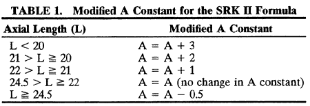This formula has been derived using the measured axial length, and no correction for retinal thickness is necessary. This formula is easier to use than the theoretically derived formulas and can even be calculated by hand with little difficulty. It requires neither a measurement nor an estimate of the preoperative or postoperative ACD or depth at which the lens is to be placed. The SRK formula was said to be superior to the early theoretic formulas in having a smaller average error per case, a smaller range of error from thehighest minus to the highest plus, and a smaller proportion of cases with greater than 2 D of error.34–36,41Proponents of the theoretic formulas have countered that the difference between immersion versus contact methods of ultrasonography for determining the axial length may be a factor. Contact methods of A-scan ultrasonography may indent the cornea and result in a falsely lowered axial length measurement.29,31,32,38 This may be one of the reasons for the increased error of the theoretically derived formulas' predicting too-strong lenses for axially short eyes. Nevertheless, in a 1999 survey, immersion A-scan ultrasonography (compared with applanation ultrasonography) was still used by only 5% of responders.42 Another reason for this error in such eyes may be the assumption of a standard ACD for use in the theoretic formulas. Shorter eyes have shallower ACDs.43,44 Use of a standard or average value for ACD in such cases may also contribute to the prediction of too-strong lenses, because the predicted power of the IOL increases with increasing ACD, all other factors remaining constant. Second- and Third-Generation Intraoperative Lens Formulas Although the so-called first generation IOL formulas were useful, they were less accurate for long or short eyes. These formulas assume a constant ACD (or position of the IOL) in all eyes, regardless of their axial length. Shorter eyes have shallower ACDs.43,44 Use of a standard or average value for ACD in such cases contributes to the prediction of too-strong lenses, because the predicted power of the IOL increases with increasing ACD, all other factors remaining constant. The measured postoperative ACD was found to be directly proportional to the axial length of the eye; longer eyes had larger ACDs. Several “second generation” theoretic formulas emerged that replaced the constant ACD with one that included a correction for axial length.45 The SRK formula was also modified to improve accuracy for short and long eyes and reemerged as the SRK II formula. This was a simple modification of the original SRK.46 The only change was that the A constant is modified according to the axial length of the eye (Table 1).