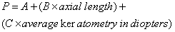 INTRAOCULAR LENS FORMULA Sanders, Retzlaff, and Kraff Formula Optic accuracy of IOL implantation depends on the accuracy of the formula used preoperatively to select the lens power. Several investigators have looked retrospectively at the results of larger numbers of IOL implantations in an attempt to approach the problem of predicting IOL power through an empiric approach.34–36 Their data were subjected to multiple regression analyses and mathematical curve-fitting techniques. They found that the power of an IOL could be best predicted by a formula of the form