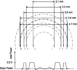 The advantage of the refractive bifocal IOL is that it focuses most of the available light for a usable image, either distance or near. The disadvantage is that lens performance is sensitive to pupillary diameter and, to some degree, lens decentration. (Obviously, if the pupil is smaller than the central zone, the optics of the more peripheral zones have little chance to contribute to an image.) The Array (Allergan Surgical, Irvine, CA) and Domilens Progress (Bausch and Lomb, Claremont, CA) lenses are multifocal lenses, designed to focus on intermediate, as well as near and far, objects. The Array is a distance-dominant, simultaneous-vision, zonal-progressive lens. It combines a posterior refractive surface with multiple anterior aspheric refractive rings, or zones, of continuously varying power (Fig. 3). Beginning with the 2.1-mm central zone, distance power is placed centrally in each odd ring (1, 3, and 5). The power gradually increases toward the periphery of the odd numbered rings to form a smooth transition with the even zones that emphasize near vision with a 3.5-D add. This provides continuous refractive power across the lens to minimize dependence on pupil size.