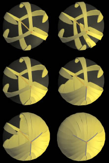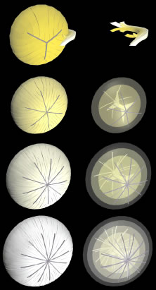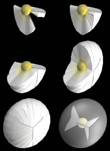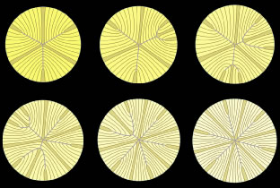 for a human lens to function properly. Human fibers are not meridians. They neither extend from pole to pole nor have tapered ends. In fact, human fibers are more than three times as wide, or flared at their ends, than at their midportions. Furthermore, the entire length of most fibers does not lay within a plane coincident with the visual axis as defined by its equatorial location. Instead, most fibers have two types of curvature: a convex-concave curvature that conveys the fiber's crescent appearance and end curvature, the curvature of anterior and posterior end segments of fibers, within any growth shell in opposite directions away from the polar axis. Together, these two curvatures convey on fibers a three-dimensional (3D) S shape (see Fig. 2). Y SUTURE OF THE FETAL NUCLEUS The ends of fibers abut and overlap within and between growth shells to form distinct latitudinal arc segments. Individually these arc segments are referred to as suture branches, and collectively they make up defined “suture patterns” within each growth shell. Fiber shape, end taper or flare, and the extent of end curvature combine to determine the number of suture branches and resulting suture patterns (Fig. 4). Growth shells are composed of two types of secondary fibers: straight and S-shaped fibers. A straight fiber is crescent-shaped, with its entire length lying within a plane passing through the visual axis as defined by its equatorial location (Fig. 5, upper left). However, only one end of a straight fiber extends to a pole. Throughout embryonic development, each growth shell normally contains six straight fibers. In the anatomic position, these straight fibers are normally positioned equidistantly around the lens equator beginning with the most superior equatorial location. Thus, each growth shell is effectively subdivided into sextets. In addition to their crescent shape, S-shaped fibers have anterior and posterior end segments that exhibit precise curvature away from the poles inopposite directions (see Fig. 5, upper right). Neither of the ends of an S fiber extends to a pole nor does its entire length lie within a plane passed through the visual axis as defined by its equatorial location. S fibers are arranged as distinct groups, positioned between straight fibers. Because of opposite-end curvature, within any embryonic growth shell, the anterior and posterior ends of S fibers become aligned as offset anterior and posterior latitudinal arc lengths (see Fig. 5, middle left). The anterior ends of proximal groups of S fibers abut and overlap within and between successive growth shells to produce anterior suture branches (see Fig. 5, middle right). However, although the anterior ends of fibers in proximal groups form anterior suture branches, opposite-end curvature dictates that their posterior ends form precisely offset posterior branches with different groups (see Fig. 5, lower left). The origin of anterior suture branches is defined by the ends of straight fibers that extend to confluence at the posterior pole but not to the anterior pole. Similarly, the origin of posterior suture branches is defined by the ends of straight fibers that extend to confluence at the anterior pole but not to the posterior pole. All suture branches extend to confluence at the poles and combine to form discrete anterior and posterior suture patterns. Throughout development the three anterior suture branches are normally oriented at 120 longitudinal degrees to one another to form a Y suture pattern (see Fig. 5, lower right). It follows then that the three posterior suture branches are also normally oriented at 120 degrees to one another but because of opposite-end curvature are offset 60 degrees to the anterior suture branches to form an inverted Y suture pattern. As additional growth shells are added throughout fetal development, each growth shell normally consists of radially longer and identically shaped secondary fibers (Fig. 6, upper left). Thus, as the Y suture branches of each growth shell become overlain in successive shells, the anterior and posterior ends of all fibers become arranged as right triangle-shaped suture planes extending from the primary fiber mass to the lens periphery (see Fig. 6, upper right, middle, and lower rows). The three anterior suture planes are normally oriented at 120 degrees to one another as are the three posterior suture planes. However, as a result of opposite-end curvature, all six of the Y suture planes are normally offset by 60 degrees to one another. STAR SUTURES OF THE JUVENILE AND ADULT NUCLEI AND CORTEX After birth and for the rest of life, primate lenses normally form progressively more complex “star suture” patterns during infancy, adolescence, and adulthood. The evolution of the “simple star suture,” produced during infancy, is depicted in Figure 7. As additional growth shells are added after birth, specific S-shaped fibers are overlain by a pair of new straight fibers. Because the ends of straight fibers delimit suture branches, new groups of S-shaped fibers with less end curvature are defined on either side of the new straight fibers. The ends of these fibers abut and overlap to form two new evolving suture branches that extend to confluence at one of the original three Y suture branches (see Fig. 7, upper middle). At this point S-shaped fibers are arranged in eight unequal groups positioned between eight straight fibers. As more growth shells are added (see Fig. 7, upper right), the new pair of straight fibers are overlain by longer straight fibers, and a second new pair of straight fibers are also added. The S-shaped fiber groups on either side of the original new pair of straight fibers are longer, forming two longer evolving suture branches that extend to confluence farther along an original Y suture branch. At the same time the ends of the second new pair of straight fibers delimit additional new evolving suture branches that extend to confluence at a second o