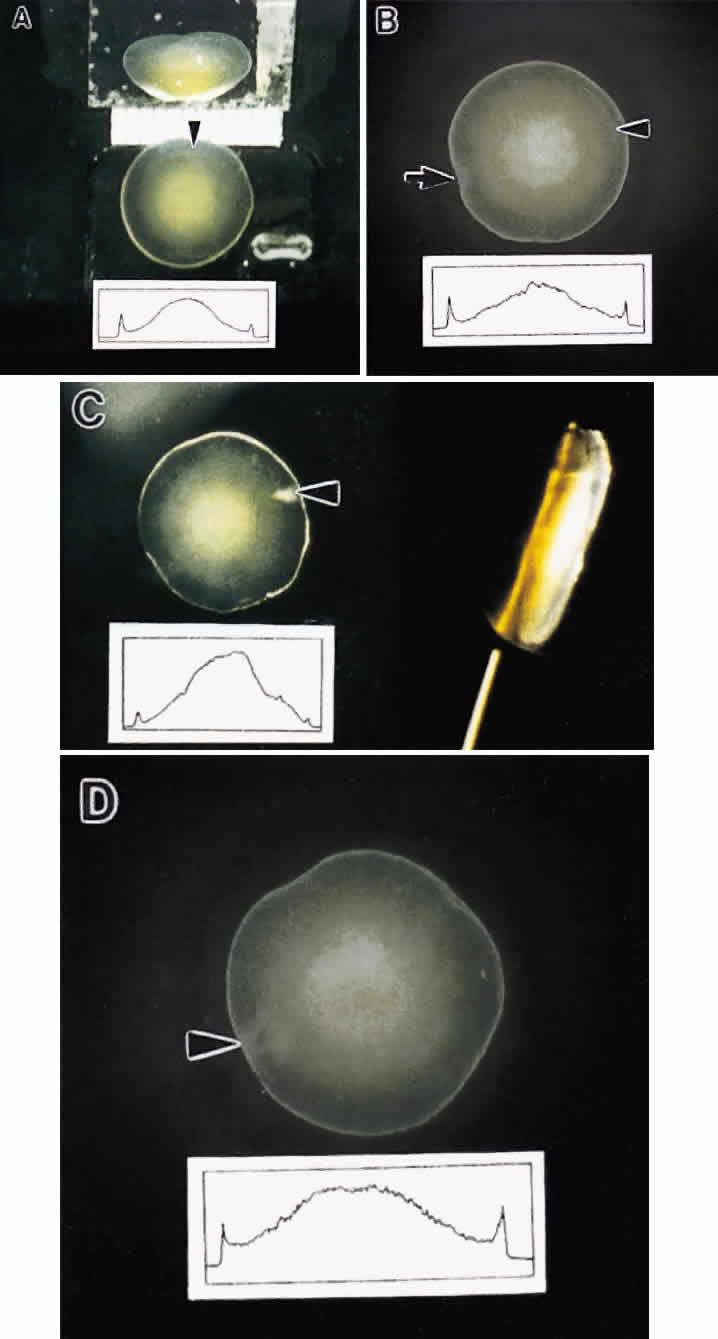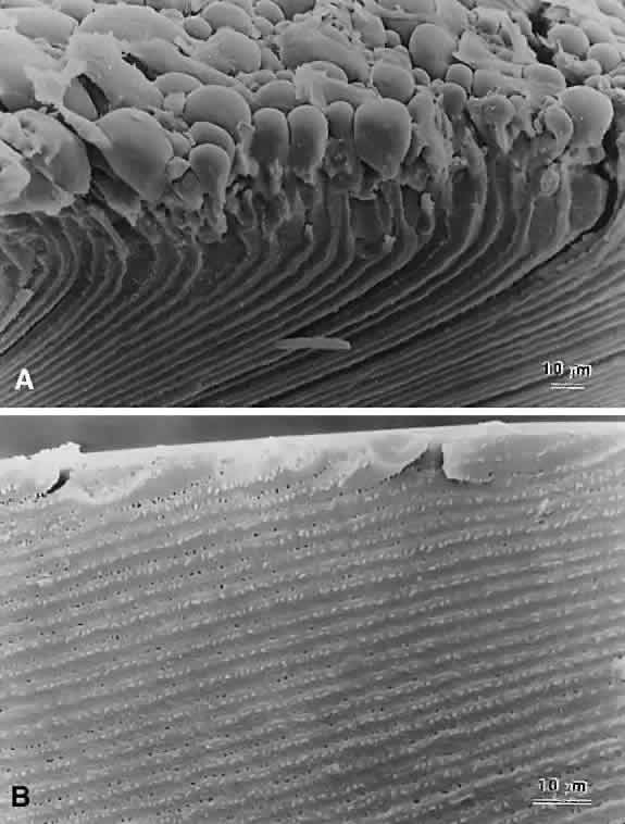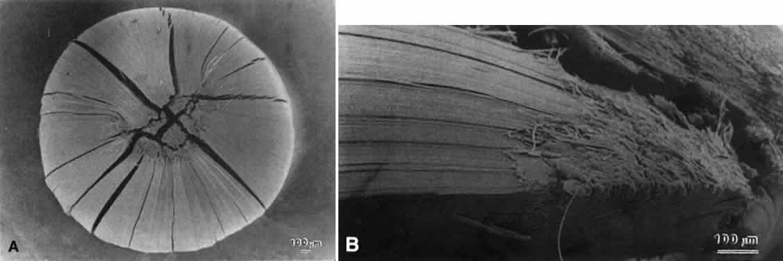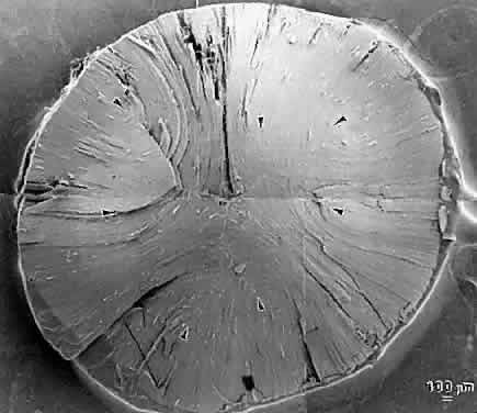 Thus, a compelling argument can be made that abnormal suture planes and cortical cataract opacities are one and the same. At surgery, the cortex of cortical cataract lenses is softer than the nucleus. Histologically, the cortex of these lenses feature swollen and liquefied fibers. It has been proposed that an increased uptake of water forces the cataractous cortical fibers apart between radial cell columns and concentric growth shells (lamellar separation). This proposition leads to speculation that the lens may be attempting to alter the structure of a localized site of increased scatter. Cortical opacities, seen to greatest advantage by retroillumination slit-lamp biomicroscopy, correspond to areas of lamellar separation that in turn are believed to correlate with “fiber folds” seen by SEM.14 Ultrastructurally, the opacities are characterized by variable amounts of degenerated cortical fiber fragments and ceroid bodies (lipofuscin), presumably the result of enzymatic digestion. Morgagnian cataracts are considered a special form of mixed cortical and nuclear cataract typified by complete liquefaction of the entire cortex. Again, it is tempting to speculate that the zones of liquefaction are an attempt by the lens to eliminate areas of scatter. This premise is strengthened by the fact that the nucleus in aged cortical cataract lenses has normal sutures and thus, would not need to undergo any internal alterations to improve light transmission. It also should be noted that to date, aged nuclear cataracts also seem to have normal sutural anatomy. |