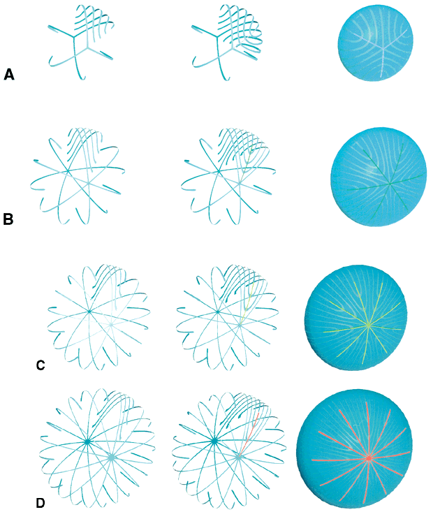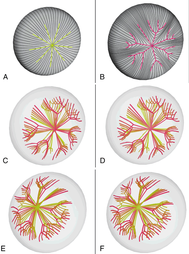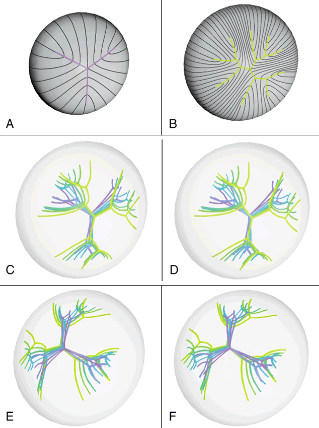 Although fibers are arranged end to end around a polar axis, they are not “meridians.” That is, fibers neither extend from pole to pole nor are they fusiform or tapered at their ends. Rather, there are two distinct types of mature secondary fibers: straight fibers and S-shaped fibers (Fig. 4). A straight fiber is crescent-shaped, with its entire length lying within a plane passed through the visual axis defined by its equatorial location. However, only one end of a straight fiber extends to a pole. An S fiber has a crescent shape, but in addition, its ends exhibit precise curvature away from the poles in diametrically opposite directions. This means that neither of the ends extend to a pole. Thus, the entire length of these fibers does not lie within a plane passed through the visual axis defined by their equatorial location. As a result of the variations in secondary fiber shape (failure of ends to extend to the poles and opposite end curvature), the ends of secondary fibers in all growth shells become aligned as specific longitudinal arc lengths. The overlapped ends of fibers in growth shells produce “suture branches” along these defined longitudinal arc lengths, and the origin of suture branches are defined by the ends of straight fibers. All the suture branches extend to confluence at the poles and combine to form discrete anterior and posterior suture “patterns.” Throughout life, variably straight or S-shaped secondary fibers are arranged specifically to form suture branches and patterns in each growth shell. During the fetal period, as successive growth shells are formed, six straight fibers evolve in specific positions around the equator to subdivide shells into six equal segments. All other fibers evolve into S fibers arranged as six distinct groups, positioned between the straight fibers. Because of opposite-end curvature, the anterior and posterior ends of these fibers become aligned as offset anterior and posterior longitudinal arc lengths. The ends of two proximal groups of S fibers overlap to produce suture branches. The location and boundaries of suture branches are defined by the ends of straight fibers. Also, as a result of opposite-end curvature, while the anterior ends of fibers in proximal groups overlap to form anterior suture branches, their posterior ends overlap with different groups to form posterior branches. In the anatomic position, the three anterior and three posterior suture branches are oriented at 120° angles to one another to produce respectively, upright Y and inverted Y suture patterns, that in turn are offset by 60°. In successive shells, suture branches formed during fetal development are positioned in identical locations so that continuous triangular suture planes are formed extending from the embryonic nucleus (primary fiber mass) to the lens periphery at birth. From an optical standpoint, the construction of suture planes has a significant negative effect on lens optics2–4 (i.e., increased spherical aberration or focal length variability [FLV] and sharpness of focus). The results of correlative laser scan, scanning electron microscopy (SEM), and three-dimensional computer-assisted drawing (3D-CAD) analysis of nonprimate lenses with Y sutures comparable to human lenses at birth, or of nonprimate lenses with “line” sutures, the simplest form of a branched suture pattern, have shown that FLV is minimal, and therefore, sharpness of focus is greatest, when a low-powered helium-neon laser passes through ordered radial cell columns. These studies also reveal that FLV is maximal, and therefore, sharpness of focus is least, when the beam passes through disordered suture planes.2–3 However, in comparable studies of primate lenses, it can be shown that an increased number of suture branches as a function of age results in superior optical quality. The reason for this paradox is that after birth, primates employ a similar but fundamentally different growth scheme than nonprimate lenses. After birth, humans produce progressively more complex sutures throughout distinct periods of growth. During the evolution of these sutures, the original six identical and symmetrically positioned Y suture branches formed throughout the fetal period serve as templates for the eventual formation of 12, 18, and 24 suture branches. The second generation of sutures in humans, the “simple star” suture, is formed from birth through early childhood. Unlike the first generation Y suture, however, the fibers of successive shells are not identical in shape or position. As a result, these suture branches are out of register and thus, “discontinuous” suture planes are formed extending from the fetal nucleus to the lens periphery. Throughout adolescence and adulthood, “star” and “complex star” sutures—the third and fourth generation of sutures, respectively, are formed in a similar manner. In star and complex star sutures, respectively, 18 and 24 suture branches eventually are formed in successive shells. Thus, adult lenses have only small triangular suture planes within the fetal nucleus, overlain by progressively more complex suture patterns in successive infantile, juvenile, and adult nuclear and cortical shells. Because the branches of the progressively more complex suture patterns in successive shells are neither identical in size nor aligned in register, they form discontinuous suture planes extending from the fetal nucleus to the lens periphery. Thus, in human lenses, the negative influence exerted by suture planes on FLV is minimized effectively. In this manner, human lenses are optically superior to nonprimate lenses with line and Y suture lenses, at least in part, because of their more complex sutures. Also, the evolution of suture branches does not occur simultaneously within a growth shell. Suture formation normally commences in the inferonasal quadrant and then proceeds in turn in the superotemporal, inferotemporal, and finally, the super