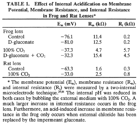 There is a considerable electrochemical gradient for Na+ to drive two of the coupled exchangers. However, there is no electrochemical gradient available to drive the outward movement of Cl- and, hence, the movements of the various charged species involved in the quadruple exchange system depend entirely on the sodium linkage. In the presence of external HCO3-, bicarbonate ions are distributed above equilibrium and, hence, are required to be actively imported. It appears that the quadruple exchanger represents the major mechanism by which this distribution is achieved. There is no evidence from the pH studies performed on mammalian lens cells and tissues that HCO3- moves across the membrane through channels80 and, indeed, such a movement would lend to drive HCO3- out of the cell down its electrochemical gradient. INFLUENCE OF pH ON MEMBRANE CONDUCTANCE AND INTERCELLULAR COMMUNICATION The internal pH of the lens is not greatly changed by an external acidification step of 0.5 unit, indicating both a lack of a proton conductance around normal pHs and also the power of lens pH regulatory mechanisms in general.29 However, the control mechanisms can be swamped by adding a weak-acid species to the medium, especially if this is accompanied by an external acidification. The most widely used technique to change pHi is simply to saturate the perifusing medium with 100% carbon dioxide. This produces a rapid and reversible decrease in pHi and intercellular coupling in a range of tissues,81,82 and the lens is no exception.28,29,83 Interestingly, interfiber communication in the inner core of the lens appears to be insensitive to acidifi-cation.28 In the frog lens, the total conductance changes in a complex manner on exposure to 100% carbon dioxide, but this is because there is both a large decrease in membrane conductance and a significant increase in internal resistance (Ri) calculated from the increase in fast component in the voltage response to a step of current.84 When pHi and internal resistance are measured simultaneously, then a measure of the pH sensitivity of Ri can be obtained. The resistance changes markedly within the range 6.6 to 7.2 and as the resting pH of the frog lens is around 7.2, then small perturbations from resting can produce significant changes in fiber coupling. In the frog lens, there also is a very significant decrease in membrane resistance at low pH, which is probably because of an increase in chloride conductance as the decrease is inhibited by replacing external chloride by the impermeant gluconate ion (Table 1).