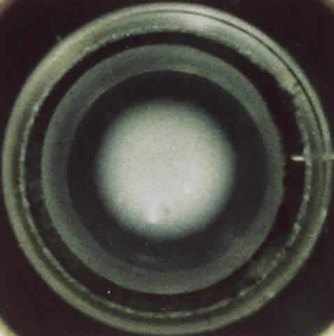 Nuclear cataracts (see Fig. 1) occur in the central region of the lens and appear to involve an acceleration of processes that occur during aging even in the normal lens. The proteins accumulate postsynthetic modifications, especially resulting from oxidation, leading to formation of protein aggregates that scatter light.5 The proteins in the nucleus also become progressively more pigmented with age; in some nuclear cataracts the color can become dark brown or even black. In such cases cataract may result from absorption of light rather than light scattering. In contrast to the cortical cataract, nuclear cataracts tend to become harder and less hydrated than normal, age-matched lens nuclei. Posterior subcapsular cataracts occur at the posterior pole immediately beneath the lens capsule (Fig. 2). These cataracts may result from improper posterior suture formation or from abnormal differentiation of lens fibers.6 In the latter instance lens epithelial cells may migrate to the posterior pole. Posterior subcapsular cataracts are formed after radiation with x-rays and long-term corticosteroid therapy and occur secondary to retinal degeneration diseases; they also occur idiopathically. |