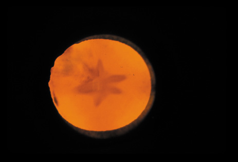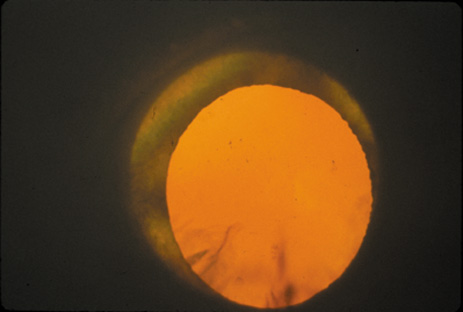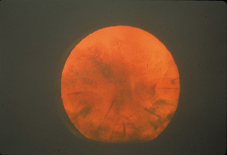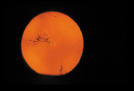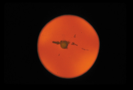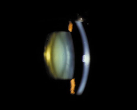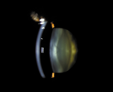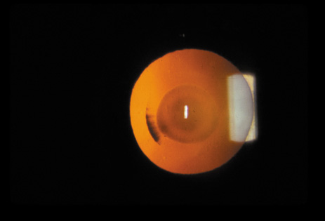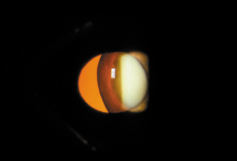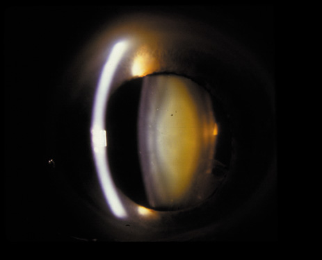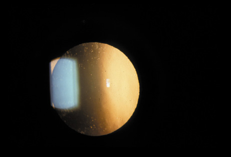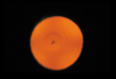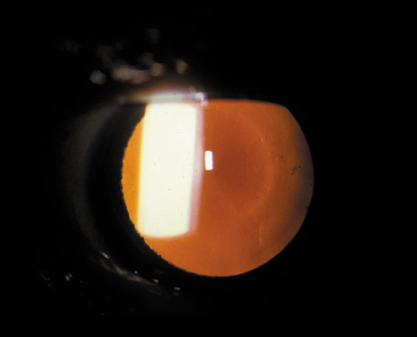 Nuclear cataracts tend to progress slowly. The refractive index of the lens changes as the nucleus progressively hardens, which usually results in increasing myopia.20,21 In some patients this is accompanied by optical distortion, especially of distant images, while near vision remains unaffected. A nuclear cataract is best seen with the narrow-beam direct illumination employed by the slit-lamp, which reveals the color and generalized haze or opalescence of the nucleus. In the early stages, the two halves (cotyledons) of the embryonic nucleus remain visible (Fig. 3). Later the entire nucleus appears as a homogeneous mass in contrast to the cortex (Fig. 4). Retroillumination may show the “oil droplet” effect (Fig. 5). Sometimes one may notice crystals in the lens nucleus (known as a Christmas tree cataract; Fig. 6A and B).