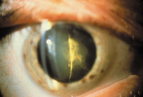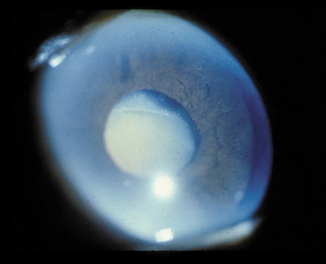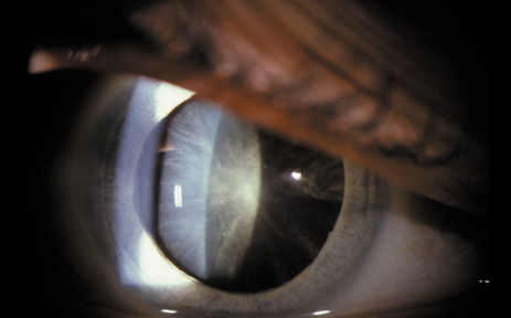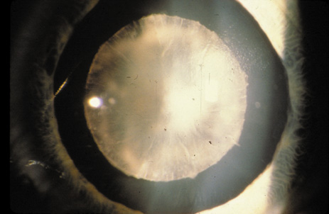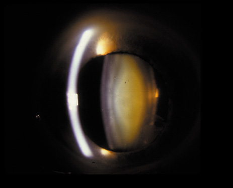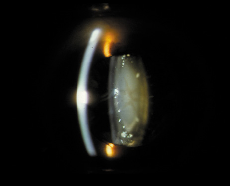 LENS EPITHELIAL DECOMPENSATION In some cases the entire anterior lens epithelium is observed to be edematous with resulting generalized haze (Fig. 20A). This is usually followed within a short period of time (a few months to 1 year) by the development of cortical cataracts and PSCs that mature quickly and cause severe, rapid loss of vision (Fig. 20B).