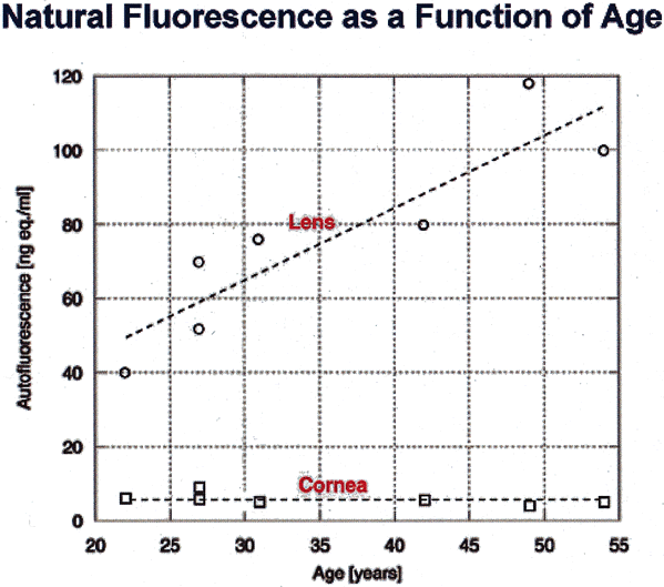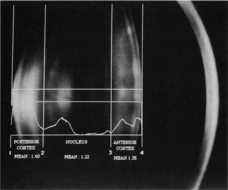RETROILLUMINATION CAMERAS. Retroillumination cameras49,50 obtain images of cortical and posterior subcapsular cataracts as shown in Figures 1B, 7, and 8. These are useful for both cross-sectional and longitudinal studies. Various manual or automated methods have been developed or are being developed for the analysis of these images to determine the size of opacities. Usually, an artificial mask with a chosen diameter is used to standardize the area of interest in the image, and either a percent area or area in square millimeters is determined. Because of the variability of the background light (the images are shadows of the cataracts using light that is backlighted from the retina or optic nerve), densitometry is unreliable. Among the methods used include computer planimetry, counting boxes, manual and automated edge detection, and automated area analysis. This method is also being used to study IOL decentration and posterior capsular opacification after cataract surgery. Examples of this type of device are the Nidek EAS 1000 retroillumination unit (Nidek, Pasadena, CA), Oxford retroillumination camera (Marcher Ltd., Hereford, UK), and Topcon CTR (Topcon Medical Systems, Paramus, NJ). Other Specialized Slit-Lamp Imaging Systems Various innovators have devised specialized slit-lamp cameras with improved acquisition and image analysis of cataracts. The Laser Slit Lamp (Bausch and Lomb Surgical, San Dimas, CA)60 was developed to measure the density of nuclear cataracts. The Sequential Color Cataract Imaging System,61 provides three lens images for analysis: (1) saggittal sections of the lens, (2) retroillumination images, and (3) images of opacities obtained by direct or side illumination. These devices promise to be useful in clinical studies of the lens and cataracts but may need further development and standardization. In summary, the use of slit and retroillumination imaging coupled with a computerized analysis system is presently the state of the art in objectively measuring cataracts. However, because of the expensive equipment, the extra time, space, labor, and effort required, and limited practical clinical use, these systems are presently used mainly in clinical research settings. The clinical judgment of the ophthalmologist based on the history and eye examination remains the standard in clinical practice. NEW METHODS UNDER DEVELOPMENT New technologies are being applied in the study of cataracts and show great promise for providing new insights into the cataract problem, as well as new devices that a clinician can use with cataract patients in the clinic. In this section, the following devices are discussed: quasielastic or dynamic light scattering (QELS or DLS), magnetic resonance imaging (MRI), spectroscopy, wavefront technology, Raman spectroscopy, autofluorescence, and optical coherence tomography (OCT). These new noninvasive techniques add to the armamentarium available to cataract researchers. Steps being taken to develop these devices for noninvasive clinical use in vivo aim for their possible use on patients for diagnostic purposes in the near future. Quasielastic or Dynamic Light Scattering The intense scattering of light by a cataract arises from a change in the interaction and organization of the constituent particles/lens proteins mediated by lenticular stress. These changes in interaction and organization are reflected in altered motional dynamics (translational and rotational diffusion) of the lens proteins in the cytoplasm. The investigation of lens protein dynamics is being successfully accomplished by the use of DLS.62 DLS is an established laboratory technique to measure the average size or size distribution of microscopic particles (3 nm to 3 μm) suspended in a fluid medium in which they undergo random Brownian (or thermal) motion. Intensity of light scattered by the particles from a laser beam passing through such a dispersion will fluctuate in proportion to the Brownian motion of the particles. Because the size of the particles influences their Brownian motion, analysis of the fluctuations in scattered light intensity yields a distribution of the diffusion coefficient(s) of the suspended particles from which average particle size or particle size distribution can be extracted. In these experiments, visible light from a laser is focused into a small scattering volume inside a sample. The scattered light is collected using a photodetector (photomultiplier tube or an avalanche photodiode) and is processed via a correlator that yields a time correlation function (TCF). For dilute dispersions of spherical particles, the slope of TCF provides a quick and accurate determination of the particle's translational diffusion coefficient. This can then be correlated to the size of particles in the solution via a Stokes-Einstein equation, provided the viscosity of the suspending fluid, its temperature, and its refractive index are known.62-66 The distribution of particle size obtained from the tissues examined (such as the lens) can then be plotted (Figs. 10 and 11).