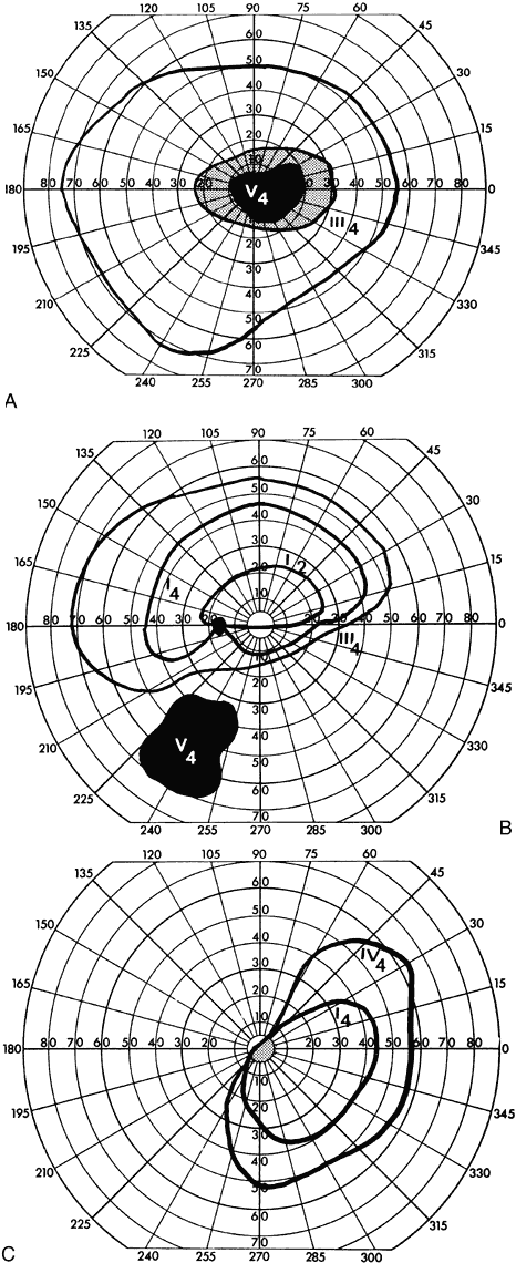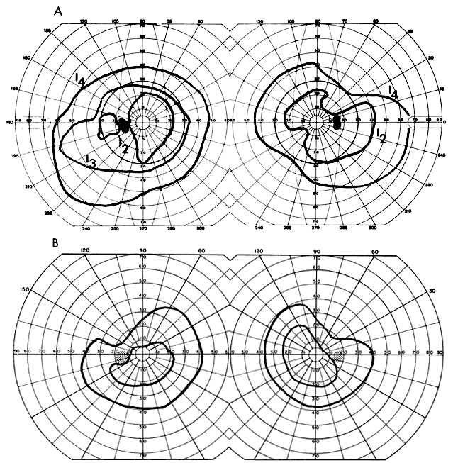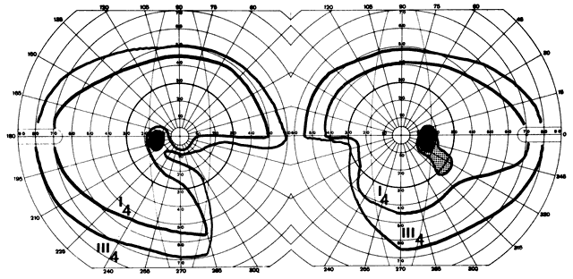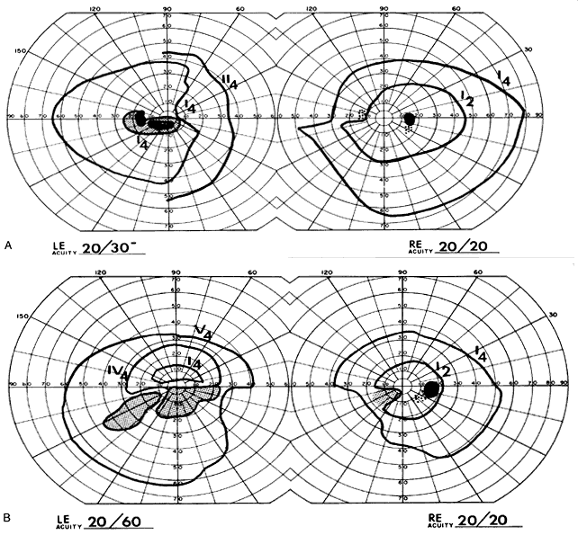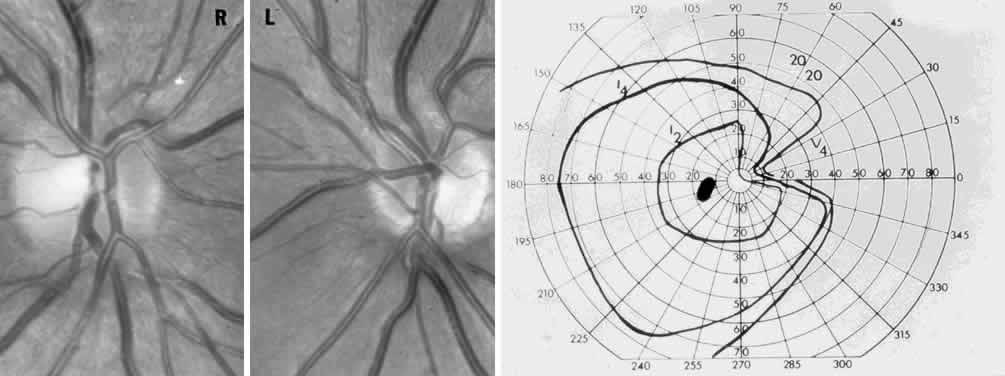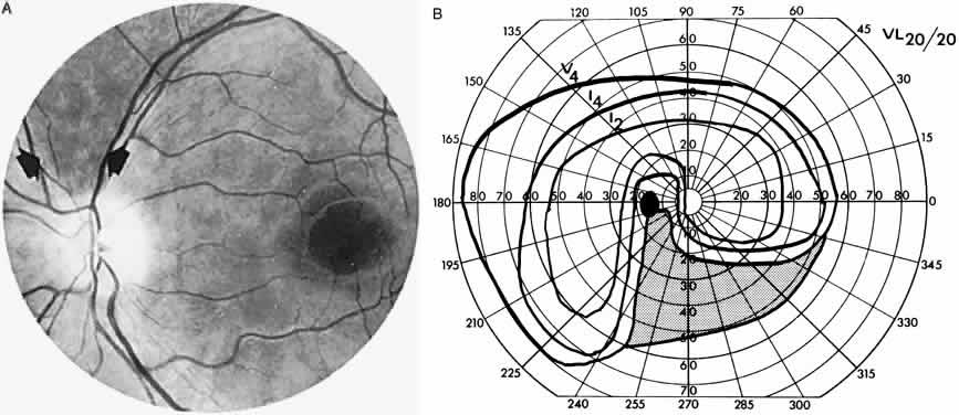 The retinal variety may be admixed in a person who suffers the more conventional attacks of migraine. It is presumed that vasospasm in the retinal circulation determines transient hypoxia, perhaps somewhat similar to the visual cortical event. On rare occasions, the fundus has been examined during typical retinal migraine episodes, and arterial constriction has been described. Wolter and Burchfield106 photographically documented such an episode and demonstrated mild “retinal edema”; vessel narrowing is also evident (Fig. 8). Fortunately, permanent complications of retinal migraine are rare. These may take the form of central retinal artery occlusion or ischemic papillopathy (see Volume 2, Chapter 16); nerve fiber bundle visual field defects may be demonstrated (Fig. 9). |