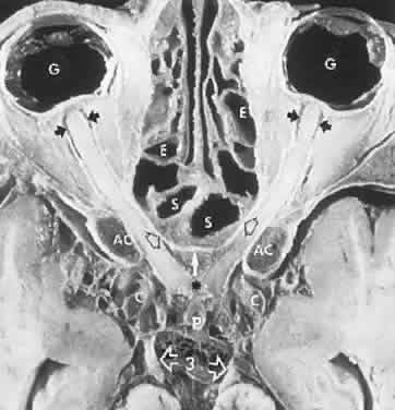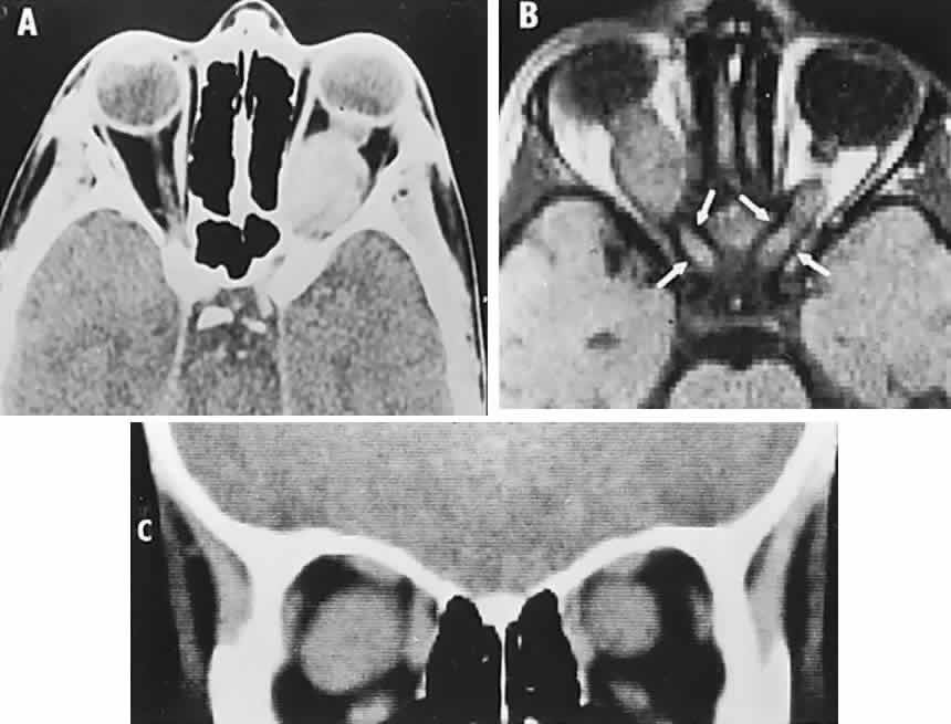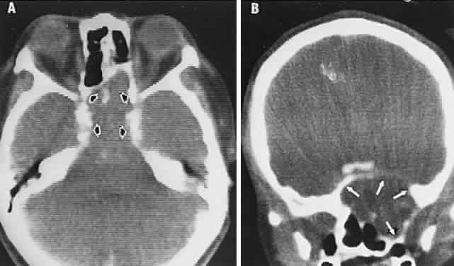 PARANASAL SINUS DISEASE Diseases of the paranasal sinuses, although perhaps disproportionately invoked in years past, are not to be overlooked as a cause of visual loss, proptosis, diplopia, or headache. Ocular motor disturbances with nasopharyngeal tumors and sphenoidal mucoceles are discussed in Volume 2, Chapter 12. This discussion considers the visual complications of inflammatory disorders, mucoceles, and carcinoma of the paranasal sinuses. The anatomic relationships with the posterior ethmoid and sphenoidal paranasal sinuses (see Fig. 11) place the optic nerves in peculiarly disadvantageous positions, not only in regard to neighboring lesions, but also in harm's way of endoscopic surgical manipulations. Anatomic variability notwithstanding, studies of fine bony details provided by thin-section coronal CT views425 show that the course of the optic canal is directly adjacent to the posterior ethmoid wall in 3%, the majority being in the lateral or superior wall of the sphenoid sinus, 15% indenting the sinus wall, and 6% passing through the sinus cavity; bone dehiscence of the optic canal is found in fully 25%, directly exposing the nerves to thin sinus mucosa. Buss and colleagues426 reported instances of ophthalmic complications of sinus surgery, including blindness resulting from orbital hematoma and optic nerve transection, nor is the chiasm itself entirely safe during endoscopic procedures.427 Mucoceles are cystic bony expansions of the paranasal sinuses that contain mucoid and epithelial debris as a result of obstruction of normal drainage through ostia. These arise in the frontal, ethmoidal, or sphenoidal sinuses and present as effects of mass lesions. With sphenoidal mucocele (posterior ethmoidosphenoidal), the optic nerves are liable to damage as the mass enlarges laterally to involve the optic canals; actually, inflammation alone without bony distortion may result in irreversible blindness.259 Visual loss is usually monocular and slowly progressive, and optic atrophy attests to chronicity. Field defects take the form of central scotomas, with or without peripheral depressions, but chiasmal syndromes (e.g., monocular blindness plus contralateral temporal hemianopia) are infrequent.428 Rapid unilateral or bilateral visual loss with severe headache may mimic pituitary apoplexy. The radiologic findings with sphenoidal mucocele include expansion of the sphenoid sinus (Fig. 44), elevation of the tuberculum sellae and chiasmatic sulcus, obliteration of optic canal and superior orbital fissure, and lateral displacement of medial orbital walls. An anterior clinoid variant of sphenoidal mucocele has been described, with visual loss mimicking retro-bulbar neuritis.429 In general, the presence of anterior clinoid pneumatization is associated with bone dehiscence and exposure of the optic nerve.425 For mucocele, rhinologic surgery is the treatment of choice, usually by endonasal decompression, and some return of vision may be anticipated unless optic atrophy is advanced.