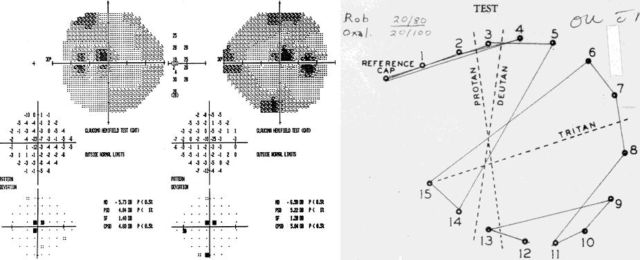 centrocecal field loss with glaucoma, macular cone dystrophy, and primary
