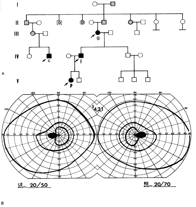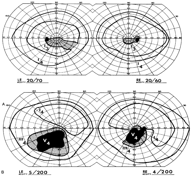 Atypical cases of selective pigmentary degeneration of the nasal retinal sectors (Fig. 2) produce field defects that may mimic bitemporal hemianopias. Such preferential involvement of the fundus nasal to the optic disc occurs in at least one-third of patients with sectoral retinitis pigmentosa. Nerve fiber bundle scotomas, somewhat mimicking glaucoma, are also recorded.7,8 Acuity is reduced when cystic or wrinkling changes occur at the fovea or as the central aperture of field finally darkens. Disc pallor and retinal arteriolar attenuation are not simply the result of ganglion cell death because the ganglion cell and nerve fiber layer of the retina are affected only late in the disease. Unilateral or bilateral disc hyaline bodies (drusen), at times most marked in peripapillary and juxtapapillary locations, occur in some 10% of all genetic subtypes.9 Central field defects with acuity loss occur with photoreceptor degeneration that especially affects the macula, so-called retinitis pigmentosa inversa, but this disorder likely represents a separate nosologic class, the cone-rod dystrophies (see below) (Fig. 3). Severe visual defect in early infancy is frequently enough caused by a primary outer segment retinal abiotrophy, Leber's congenital amaurosis, although this is probably not a single clinical entity. This disorder is characterized by the following: severe impairment of vision, present at birth or becoming evident during early to late infancy; a fundus that may initially approach normal, but within years, optic atrophy, diffuse fine pigmentary degeneration, and attenuation of the arteriolar tree are evident; and either an absent or a markedly reduced ERG response. Other variable features include nystagmus, photophobia, digito-ocular maneuver (forceful eye rubbing with sunken globes; “blindisms”), strabismus, cataracts, hyperopia, mental retardation, deafness, renal anomalies, seizures, hydrocephalus, and focal neurologic deficits (e.g., cerebral diplegia). Hereditary transmission is typically autosomal recessive10 (see Volume 2, Chapter 13).