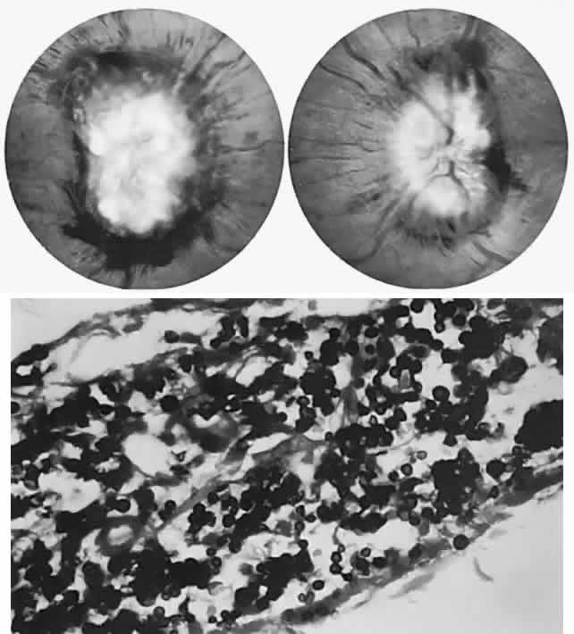 AIDS-related optic neuropathies generally reflect direct infestations of viral, spirochetal, or fungal organisms, but grossly diminished axonal counts may indicate a primary AIDS optic neuropathy.220 Otherwise, cytomegalovirus retinitis with spread to the nerve, or as an initial papillitis, is associated with poor visual outcome even with therapy.221 Likewise, cryptococcosis (Fig. 34) may be associated with chronic optic meningitis, with insidious or rapid vision loss related to fulminant nerve necrosis.222 Optic nerve sheath decompression for raised CSF pressure in cryptococcal meningitis has been reported to improve function.223 Other infectious agents include Toxoplasma gondii,224 varicella-zoster,225,226 and Histoplasma capsulatum.227