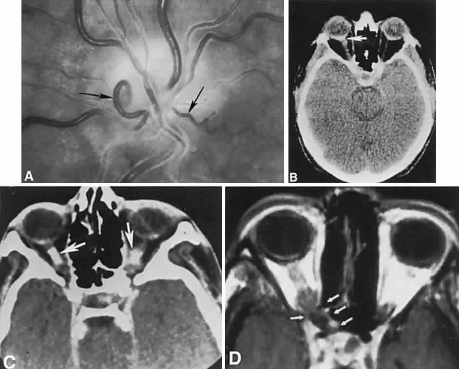 Histopathologically, zoster involves the optic nerve as an inflammatory arteritis with associated mild leptomeningitis. With these lesions in mind, it was believed that the recovery of vision in the patient in the above case was directly attributable to intraorbital and systemic steroids. Diffuse idiopathic perioptic meningeal thickening (cranial fibrosclerosis; hypertrophic pachymeningitis) is a relatively rare cause of progressive visual loss, with or without associated systemic multifocal fibrosclerosis.264 Signs and symptoms include chronic headaches, optic disc atrophy or edema, meningeal thickening on MRI (Fig. 36), CSF pleocytosis and protein elevation, dural sinus thrombosis, and cranial nerve palsies producing ophthalmoplegia, hearing loss, and facial palsies. Other causes of pachymeningitis must be ruled out, including sarcoidosis, tuberculosis, syphilis, rheumatoid arthritis, dural carcinomatosis, meningioma-en-plaque, and plasmacytoma. These conditions may be distinguished by accompanying clinical findings and definitive meningeal biopsy. Corticosteroid and immunosuppressive agents are undoubtedly useful. |