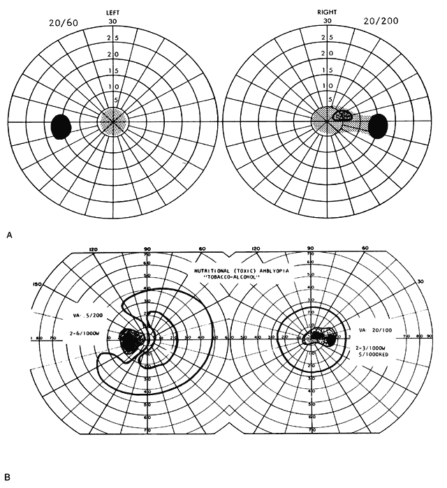 VITAMIN DEFICIENCIES AND “TOBACCO-ALCOHOL AMBLYOPIA” Regarding the origin of nutritional neuropathies, the great weight of clinical evidence overwhelmingly favors a dietary deficiency of B-complex vitamins (predominantly thiamine) rather than the direct toxic effects of tobacco or chronic alcoholism. Even when “tobacco amblyopia” is touted as the common variety of abuse-related optic neuropathy, multiple factors seem to converge: patients are often elderly men with diets poor in protein and B vitamins; vitamin B12 absorption may be defective; alcoholic consumption is variable; rough grades of pipe tobacco are smoked. Of greater practical importance, there are no clinical differences among “tobacco amblyopia,” and “tobacco-alcohol amblyopia,” optic neuropathy in chronic alcoholism, or malnutrition optic neuropathy. It appears that dietary deficiency is the common denominator, and thiamine improves the condition in spite of continuing abuse of alcohol or tobacco.450 It goes without saying that alcoholic patients tend not to disclose accurate daily consumption figures, and history-taking from relatives and friends may be more reliable, including details of diet. Although the patient may staunchly deny alcohol abuse, at the slit lamp, the examiner may be only too acutely aware of the odor of alcoholic breath. Normal body weight, much less obesity, is uncommon in this group. Bankers, lawyers, and even physicians are not immune, although the following case history is more common: