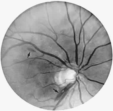 neuropathies (see Part II of this chapter). The onset of retinal arterial occlusion rarely goes unnoticed by the patient, but unlike venous thrombosis, arterial occlusions of a minor degree may be difficult to discern ophthalmoscopically, especially if days or weeks pass before the fundus is examined. Muci-Mendoza et al42 used fluorescein fundus angiography to demonstrate ophthalmoscopically occult emboli and post-embolic endothelial damage after episodes of amaurosis fugax (see below, Carotid Atheromatous Disease). With acute infarction, the retina becomes opaque and takes on a creamy or gray appearance. Atheromatous material in the form of “bright plaques” of cholesterol or other microemboli may be seen, especially lodged at arterial bifurcations (Fig. 5). Segmental arteriolar mural opacification (see Fig. 5D) may follow retinal microembolization by weeks to months, and such sheathing may be as useful as the recognition of the cholesterol embolus itself.43 ERG may show diminished B-wave amplitude, a finding indicating inner retinal ischemia. Weeks following retinal infarction, the optic disc becomes pale, and the arterial tree becomes narrowed in the sector corresponding to the arterial occlusion. The visual field defects with arterial occlusion are variable, but they usually take the form of arcuate scotomas or “altitudinal hemianopias” of the superior or inferior half fields (Fig. 6). These altitudinal or pseudo-quadrantic defects are dense and are easily discovered by hand- or finger-counting confrontation techniques. The localizing value of the position of the “vertex” of quadrantic and wedge-shaped defects was pointed out by Alfred Kestenbaum. When the wedge originates at or points toward the blind spot, the defect is due to a retinal arterial occlusion or a lesion at the edge of the optic disc (including the arcuate defects seen in glaucoma). The differential diagnosis of arcuate scotomas, that is, with radial borders originating at the blind spot (see Fig. 6, right field), includes glaucoma, ischemic optic neuropathy, branch retinal artery occlusion, hyaline bodies of optic disc, congenital optic pit, juxtapapillary inflammation, and, rarely, chiasmal interference (see Volume 2, Chapter 6, Fig. 1F). CAROTID ATHEROMATOUS DISEASE The pathogenesis of embolic retinal arterial occlusions is diverse, but most are associated with atheromatous degeneration of the cervical carotid arteries. Since the observations by Fisher44 of mobile intravascular material during episodes of transient retinal ischemic episodes (amaurosis fugax), an embolic source is commonly invoked, especially when any material is detected ophthalmoscopically within the retinal circulation. Such retinal emboli have been examined histopathologically and may consist of cholesterol crystals,45 platelet aggregates,46 fibrin and blood cells,47 and neutral fat.48 A study of the prevalence of asymptomatic retinal emboli among 3654 persons aged 49 years or older disclosed photographic evidence in 1.4%, the majority being judged as cholesterol; risk for subsequent stroke is not yet calculated.49 On the other hand, the incidence of visible emboli in retinal arterial occlusion is estimated at about 20%.50 Wilson and coworkers51 compared the incidence of carotid and cardiac disease in 103 patients with retinal artery occlusions and reported cardiac valve abnormalities in 28; of 62 carotid arteriograms, 35% were normal, 13% were occluded, and the remainder showed irregularity or significant stenosis. In a small group of 41 patients with transient monocular visual loss or retinal artery occlusion, no cardiac or carotid source was uncovered in two-thirds of subjects, ipsilateral carotid disease was seen in 11 (27%) cases, and a cardiac source was noted in a single patient.52 Even in those patients without ophthalmoscopically visible emboli, it is possible that the embolus either has lodged in the retro-laminar portion of the optic disc or has disintegrated and passed to the retinal periphery. Primary thrombosis in the retinal arterial circulation, beyond evidence of frank vasculitis or hypercoagulable states, is considered obsolete. Vasospasm, on the other hand, is an unlikely candidate to explain arterial occlusion, although rare instances of otherwise unexplained transient visual loss are reported.53 Other noncarotid sources of emboli, including cardiogenic, are discussed below. Transient ischemic episodes involving the retinal arterial tree produce the well-known symptom of amaurosis fugax (“fleeting darkness, or blindness”; ocular transient ischemic episode). This phenomenon may be defined as a painless unilateral, transient loss of vision that usually progresses from the periphery toward the center of the field. Often, the visual deficit takes the pattern of a dark curtain descending from above or ascending from below. Complete or subtotal blindness follows in seconds and lasts from 1 to 5 minutes (rarely longer). Vision returns to normal within 10 to 20 minutes, at times by reversal of the pattern of progression. Incomplete variations produce less distinctive sensations such as “looking through a fog … through raindrops … through haze.” By convention, the term amaurosis fugax is reserved for the ocular symptoms as described, which are usually distinguishable from other episodic visual disturbances (see Volume 2, Chapter 1), and it implies transient ischemia in retinal arterial circulation. Those conditions with principally monocular transient visual loss are listed in Table 3.54 It is likely that microembolic material in the form of fibrin-platelet aggregates momentarily occludes retinal vessels, then fragments and passes into the retinal periphery. If disaggregation with reconstitution of blood flow does not take place within several minutes, ischemic damage to inner retinal layers may be irreversible, and permanent visual defects may ensue. Most evidence indicates that the major source of retinal micro