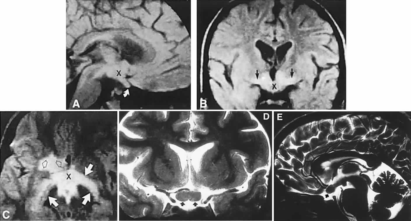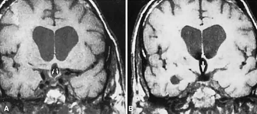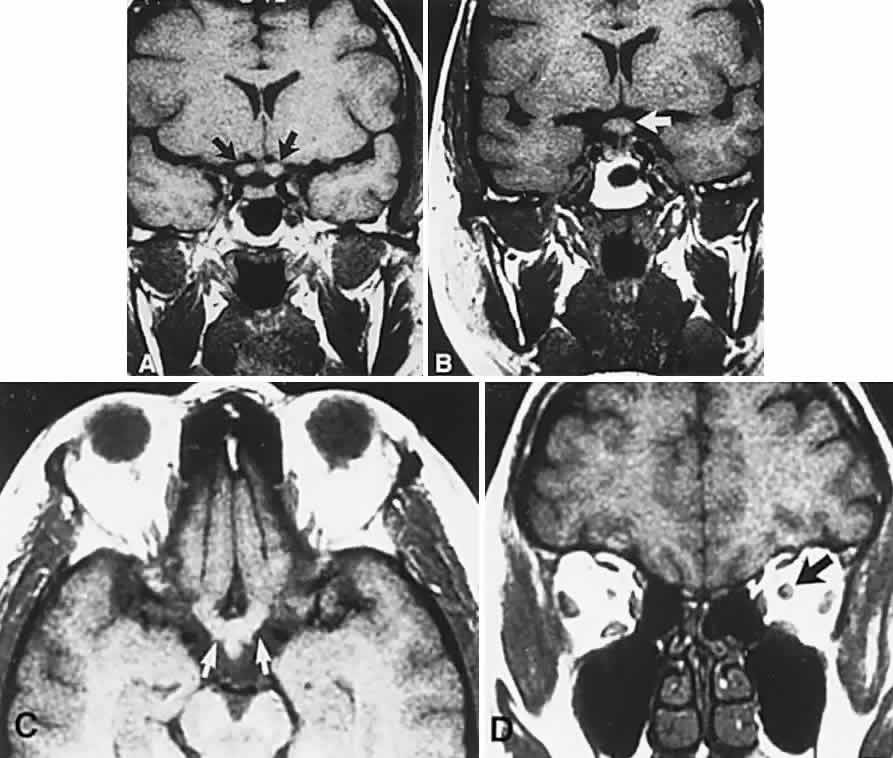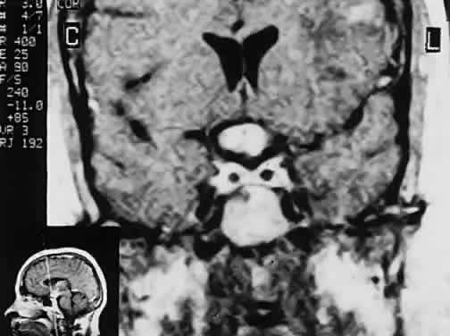 The clinical and radiographic characteristics of primary empty sella were thoroughly reviewed by Neelon and associates,220 the following features being notable: obese women predominate (27 women, 4 men), ranging in age from 27 to 72 years, with a mean age of 49 years; headache is a common symptom; in the Duke University study there was no instance of visual impairment due to chiasmal interference; an enlarged sella was found serendipitously on plain skull films obtained for evaluation of headaches, syncope, or other symptoms; pseudotumor cerebri was present in 4 women; 20 patients had normal pituitary function, and 8 demonstrated endocrine disturbances that included panhypopituitarism, or GH, gonadotropin, and thyrotropin deficiency. Hyperprolactinemia may occur in patients with intrasellar cisternal herniation without evidence of pituitary tumor, but the elevation of serum PRL is usually moderate. For example, in a study221 of 47 patients with empty sella, hyperprolactinemia was found in 6, with a range of 39 to 123 ng/L. Of course, adequate neuroimaging with enhanced CT or MRI (Fig. 20) will resolve the question of empty sella vs. mass lesion. Children are rarely included in this diagnostic category, but they are reported222 with primary empty sella and associated congenital anomalies, including delayed puberty, anosmia, diabetes insipidus, delayed growth, and optic atrophy.223 In a series of 19 patients with primary empty sella at the University of Michigan,224 the following features were noteworthy: all were women; 12 patients complained initially of headache; in 7 patients, visual disturbances were prominent subjective symptoms (blurred vision, diplopia, micropsia); 3 had bilateral papilledema and were believed to have pseudotumor cerebri; and 2 patients demonstrated minimal relative hemianopias without obvious cause. Although it is speculated that the high female preponderance noted in all series implies a mechanism related to physiologic hypertrophy and subsequent involution of the pituitary gland during pregnancy, there was no significant relationship between the number of pregnancies and sellar volume in the Duke University series. In the secondary form of empty sella that occurs following pituitary surgery or irradiation, adhesions may form between tumor “capsule” (or sellar diaphragm) and the optic nerves and chiasm. Retraction of these adhesions may draw the visual system downward into the empty sella, with resulting visual defects.225,226 Packing the sellar cavity prophylactically to elevate the diaphragma has been proposed,224 or “chiasmapexy” when chiasmal herniation is observed at surgical re-exploration.227 |