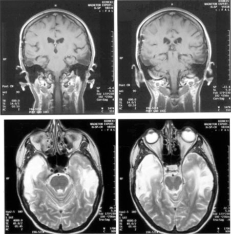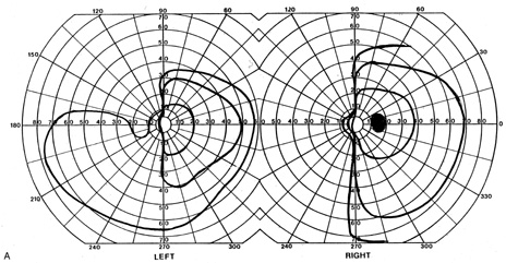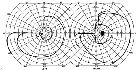 Posttraumatic transient cerebral blindness is a syndrome that affects children and young adults.73,104,105 It occurs in about 1% of closed head injuries.72,86,106 The impact is often in the parieto-occipital region.72,73,105,107Headache, confusion, anxiety, nausea, and vomiting are frequent,105 as is loss of consciousness at the time of injury in young children and adults.86 Blindness may occur immediately or after a few minutes,73,86,105,107 and in adolescents sometimes after a few hours.86 Vision recovers within 24 hours,105,107 although the course in adults is more variable, with occasional residual deficits.86 CT of the head often is normal,101,105,107 but EEG shows bilateral occipital slowing.73 Protracted recovery, especially in children, may indicate cerebral contusions107 or occipital lobe infarction from tentorial herniation.108 There can be a personal or family history of seizures and migraine.86 The course of cerebral blindness is variable. Blindness can last hours, days, or weeks; or evolve into a hemianopia or other field defect. The patient may recover fully, or the deficit may become permanent.71,76,102 If there is recovery, it usually occurs within 5 months.71 Recovery of useful vision is more likely in children than adults.102 The prognosis is better with hypotension during cardiac surgery than with other causes.71 The prognosis with hypoxia is worst for preterm infants, who tend to have periventricular leukomalacia rather than parasagittal watershed infarctions. Optic radiation damage on their CT or MRI is a poor sign.109 Normal MRI in most other settings is a good prognostic sign71,109 and significant recovery can occur if hypoxic damage is limited to the visual cortex.109 Spike-and-wave discharges on EEG are associated with multiple handicaps and poor visual recovery.71 Transient cerebral blindness occurs in about 1% to 15% of patients with pre-eclampsia or eclampsia.97,98,110 Fluctuations in blood pressure with peripartum blood loss may contribute.111 The pathogenesis is analogous to that of hypertensive encephalopathy, with development of petechial hemorrhages and focal edema from impaired cerebral vascular autoregulation, and ischemia from vasospasm.98,112 CT scans may be normal or show bi-occipital lucencies.98,113 MRI is more sensitive, showing T2 hyperintensities and T1 hypointensities similar to those in hypertensive encephalopathy.112,114 Management is that of eclampsia, with magnesium sulfate, fluid restriction, and blood pressure control. The prognosis is good, with virtually all women regaining vision within a few hours to a week, rarely as long as 3 weeks.98 The differential diagnosis of eclamptic visual loss includes cerebral venous thrombosis115 and systemic hypoperfusion resulting from pulmonary emboli.116 Antiphospholipid antibodies may be associated with infarction or venous thrombosis.117 Eclampsia also can affect the eye, causing retinopathy with retinal detachment, edema, and vascular thrombosis118 or, more rarely, anterior ischemic optic neuropathy.119 Pituitary apoplexy can present with severe headache and visual loss and is a medical emergency. Anton's Syndrome About 10% of patients with cerebral blindness are not aware of their deficit and insist that they can see.57,60 This syndrome may be considered a form of anosognosia (denial of acquired impairment) that has been attributed to right hemispheric dysfunction or disconnections between the thalamus and right parietal lobe.120 Denial of blindness can also occur in patients with ocular or optic nerve disease when there is concurrent dementia or a confusional state. In contrast, altered mental status is not a necessary accompaniment of denial of blindness with lesions of the visual cortex. Thus, Anton's syndrome might be more specifically defined as denial of blindness in the absence of dementia or delirium. However, even this presentation is not specific to lesions of visual cortex, as it can result from unusual combinations of bilateral optic neuropathy and bilateral frontal lobe disease.121 Abnormalities in the Remaining Visual Field Some patients with hemifield visual defects complain of difficulties with their remaining vision, such as visual fatigue or blurring, especially in tasks with high attentional demands such as reading, finding a face in a crowd, or driving a motor vehicle. There is evidence that unilateral lesions produce not only contralateral scotomata but also deficits in both the remaining ipsilateral and contralateral visual fields. There are spatial and temporal contrast sensitivity deficits in the supposedly normal ipsilateral hemifields of patients with homonymous hemianopia.122 There is reduced sensitivity and increased response times to signals in both hemifields and reduction in the “useful field of view.”123 Saccadic response times to visual targets in the ipsilateral hemifield are also reduced.124 The origins of these subtle bilateral effects of unilateral lesions are unclear. One hypothesis is that the inevitably associated white matter damage disrupts visual connections, including projections from V1 to other visual areas, callosal connections between the same or different visual areas in the two hemispheres, and feedback projections from a higher visual area to a lower one. A lesion in one area thus can affect the functioning of another, more distant area (diaschisis). Disrupted connections can impair the synthesis of information from other vision areas and both hemispheres, producing “long-range” disturbances in both hemifields, outside the limited contralateral scotoma. Damage to extrastriate regions may have similar bilateral long-range effects, as shown in monkeys with lesions of area V4, for example. Thus associated extrastriate damage may contribute to impaired processing efficiency in the ipsilateral field of patients with hemianopia.123 Standard kinetic and automated static perimetry are not designed to detect such deficits. These tests ignore respon