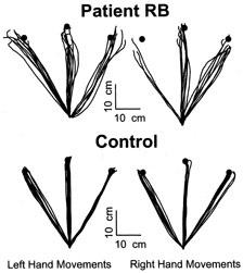 BALINT'S SYNDROME Balint's syndrome486,487 is a loosely associated triad of visuospatial dysfunctions: simultanagnosia, optic ataxia, and ocular motor apraxia. Patients have a deficit in distributing spatial attention, in which they cannot pay attention to more than a few objects at a time. Thus these patients have trouble with visual search tasks488 and in maintaining attention over large regions of space.489 This defect may be equated to simultanagnosia, the inability to interpret a complex scene with multiple interrelated elements, despite intact perception of the individual elements.490 What constitutes an element or object is a complex matter, depending not only on visual properties, but also cognitive factors. For example, such patients can identify single letters but have difficulty identifying multiple letters in a random string. However, if that string is a word or even a pronounceable nonword, performance is better, indicating that the letters have been grouped into a single linguistic element.466 Similarly, improvement in detecting multiple objects improves if they are semantically related.488 An additional spatial problem is visual disorientation.464 This is a defect in judging the spatial position and distance of objects. This problem may contribute to optic ataxia, which is difficulty in guiding reaching movements to visual targets despite normal limb strength491 and position sense. Misreaching may represent more than just visuospatial misperception, because it can affect one arm more than the other486 and affect reaching to somatosensory targets, such as the patient's own body parts.492 Thus, a multimodal spatial targeting system for hand guidance may be dysfunctional. Laboratory measures of reaching, pointing and grasping have shown increased latency, abnormal hand trajectories, increased variability of the end of the reach, tendency to reach to one side, as well as dissociations of distance and direction control (Fig. 28).493–495 The ocular motor abnormalities of Balint's syndrome are not well characterized. There are probably several components. Psychic paralysis of gaze or acquired ocular motor apraxia indicates a difficulty in initiating voluntary saccades to visual targets.487,496 Although reflexive saccades to suddenly appearing visual objects or noises are normal, these patients may have great difficulty making a saccade on command. A related problem is spasm of fixation.497 Today this is more narrowly defined as a problem in initiating saccades away from a fixation point that remains visible.498 Once saccades are generated, there may be gross inaccuracies in saccadic targeting, causes the eyes to make a series of wandering saccades in search of the target, which is nevertheless visible.464,491 Once on the target, patients can also have trouble maintaining fixation. To diagnose Balint's syndrome one must exclude more general cognitive dysfunction, hemineglect, and extensive visual field defects. Perimetry can be difficult because of inattention, fatigue, and difficult fixation.499–501 Many reports of Balint's syndrome are marred by inadequate documentation of visual fields. Extensive peripheral scotomata leaving only “keyhole vision”502 can create signs that mimic all components of the Balint triad. Simultanagnosia usually is tested by asking the patient to report all items and describe the events depicted in a complex visual display with a balance of information in all quadrants, such as the Cookie Theft Picture from the Boston Diagnostic Aphasia Examination.312 Patients omit elements and fail to realize the story being shown. At the bedside, patients can be asked to pick up a number of coins scattered on a table.464 To test for optic ataxia, easily seen items are placed at different locations within arm's reach of the patient, who is asked to touch or grasp them, with each hand tested separately for each side of hemispace.503 With unilateral lesions, the problem tends to be worse for reaches with the contralateral hand or hemispace. Misreaching for visual targets is contrasted with reaching to parts of their own bodies, although more diffuse disturbances in parietal spatial representation may impair both.492 Such generalized misreaching can be confused with cerebellar dysmetria, but the latter usually is accompanied by intention tremor and dysdiadocokinesia. Ocular motor apraxia is confirmed by comparing the patient's difficulty in making saccades to command with the ease in making reflexive saccades to sudden targets in the natural environment, such as an unexpected noise. Although simultanagnosia has been held responsible for optic ataxia and ocular motor apraxia,491 each of the elements of Balint's syndrome is dissociable.464,474,491,504 Therefore the ocular, reaching, and attentional disturbances may each have a different pathophysiologic origin, even if they contribute to each others' manifestations. The incapacity to combine elements into a whole seen in simultanagnosia was thought to reflect an inhibitory action of a focus of attention on surrounding regions.502 Failure of long-range spatiotemporal processes to sustain and distribute attention are likely.488,489 Reaching under visual guidance may be mediated by recursive processes involving intercommunication among a cerebral sensorimotor network,505 which can be disrupted at a number of key points, including parietal and frontal cortex.506,507Inaccurate saccades and difficulty initiating saccades reflects damage to specific structures involved in saccadic control, likely homologues of the lateral intraparietal area508 and/or the frontal eye field. There are often other disturbances. These include a variety of bilateral hemifield defects, usually affecting the lower quadrants more severely, and other visuospatial defects such as left hemineglect, akinetopsia, and astereopsis.487,509,510 Smooth pursuit often is impaired. Patients may complain of distorted perception, with metamorphopsia, micropsia, 