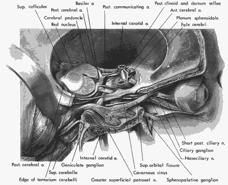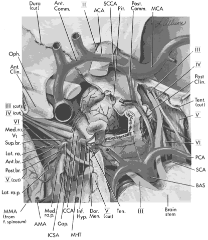 The peripheral course of the third nerve is as follows (Fig. 5): as the nerve exits ventrally from the midbrain into the interpeduncular space, it passes beneath the origin of the posterior cerebral artery and lies parallel and lateral to the posterior communicating artery. Klintworth10 pointed out that, in instances where the basilar artery bifurcates at a low level, the oculomotor nerve may be angled downward at the point where the posterior cerebral artery crosses the nerve, and vascular grooving of the superior aspect of the nerve is present in approximately one third of normal brains. The nerve runs between the free edge of the tentorium and the lateral aspect of the posterior clinoid, where it pierces the dura to enter the cavernous sinus. The oculomotor trunk occupies the superior aspect of the cavernous sinus (see ahead to Fig. 17) and separates into superior and inferior divisions at 4 to 5 mm before the superior orbital fissure. Fiber count of the superior division is about one-third that of the inferior,11 and it has been suggested that relative pupil sparing in cavernous sinus or orbital apex lesions may reflect preservation of the inferior branch. The inferior branch supplies the medial and inferior recti, inferior oblique, and parasympathetic root to the ciliary ganglion (pupil sphincter); the superior branch innervates the superior rectus and levator palpebrae. According to Kerr,12 the pupillomotor fibers are superficial in the oculomotor nerve trunk, lying just internal to the epineurium. It is thought that this superficial position makes the pupillomotor fibers especially vulnerable to compression. In more anterior segments (e.g., cavernous sinus), however, pupillomotor fibers may be preferentially spared even in the presence of total oculomotor palsy. It is likely that involvement or “sparing” of the pupil reflects the nature and acuteness of the lesion, rather than which specific segment of the oculomotor trunk is compromised. The trochlear fascicles pass dorsally, lateral to the aqueduct, and the nerve exits the midbrain and crosses the contralateral fourth nerve in the anterior medullary velum, just caudal to the inferior colliculi. The fourth nerve is the only cranial nerve to exit the brain stem dorsally. The nerve continues laterally around the midbrain tectum, crosses the superior cerebellar artery, and reaches the free edge of the tentorium, where it enters the dura and runs forward into the cavernous sinus (see Fig. 5). The fourth nerve enters the orbit through the superior orbital fissure, but above the annulus formed by the origin of the recti muscles, and innervates only the superior oblique muscle. The abducens nerve emerges from the brain stem at the lower border of the pons in the pontomedullary sulcus, approximately 1 cm from the midline. The nerve ascends the ventral face of the pons for a short distance, is crossed by the anterior inferior cerebellar artery, and pierces the dura of the clivus approximately 2 cm below the posterior clinoids (see Fig. 5). The sixth nerve traverses or passes above the inferior petrosal sinus, runs beneath the petroclinoid ligament (Gruber), and enters the cavernous sinus. The sixth nerve lies freely within the body of the cavernous sinus, unlike the oculomotor and trochlear nerves that are supported in the lateral wall of the sinus. Some sympathetic fibers are briefly attached to the abducens, passing onward to the ophthalmic trigeminal.13 From the cavernous sinus, the nerve passes through the annular segment of the superior orbital fissure and innervates only the lateral rectus. Milisavljevi According to the anatomic review by Lapresle and Lasjaunias,15 there are three arterial “systems” that vascularize the cranial nerves: the inferolateral trunk arises from the intracavernous siphon of the internal carotid artery and nourishes cranial nerves III, IV, VI, and V-1; the middle meningeal system supplies nerves VII and V-2,3; and the ascending pharyngeal system supplies nerves IX through XII. The oculomotor nerve is also vascularized by the basilar artery system in the region of the posterior perforated substance, and in the supracavernous region by the artery of the free tentorial margin (Bernasconi). The clinical correlation of ischemic cranial neuropathies with these arterial territories is not entirely clear. |