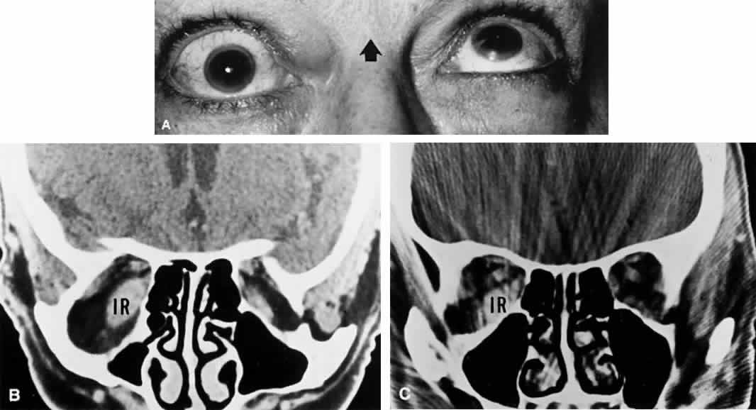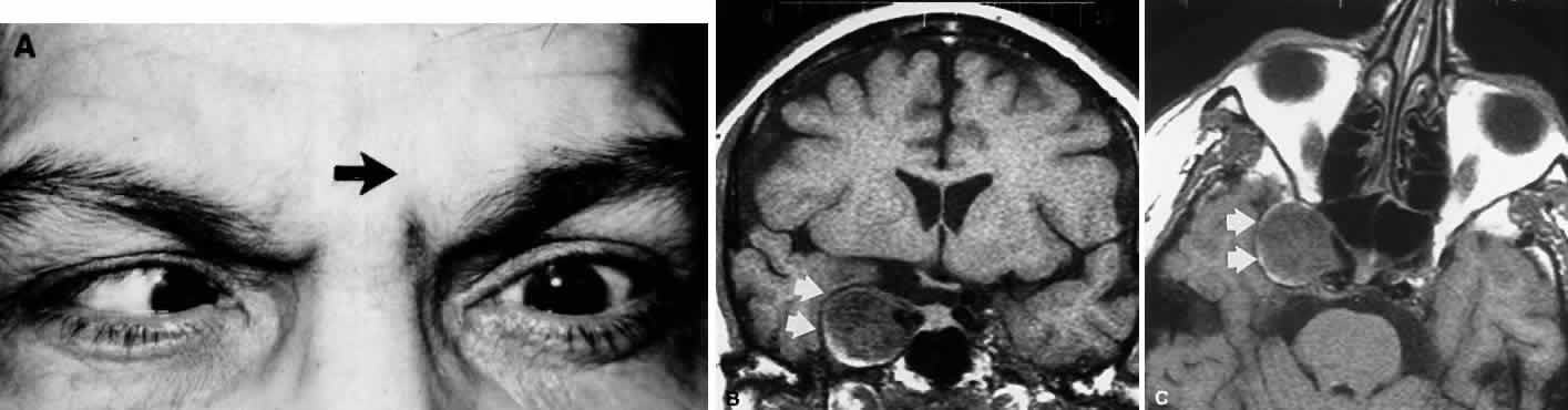 ORBITAL LESIONS Oculomotor nerve palsies with orbital lesions are usually accompanied by abducens weakness and proptosis. In the absence of proptosis, anterior cavernous sinus lesions may not be distinguishable from those involving the superior orbital fissure or orbital apex. Nonspecific inflammations of orbital tissues (orbital pseudotumor) may produce palsies of extraocular muscles in variable combinations, but other manifestations (e.g., pain, chemosis, ocular inflammation, proptosis) are usually present. Orbital trauma, unless overlooked or forgotten, usually presents no difficulty in diagnosis. Forced duction testing and orbital ultrasonography and/or enhanced CT imaging are indicated. |