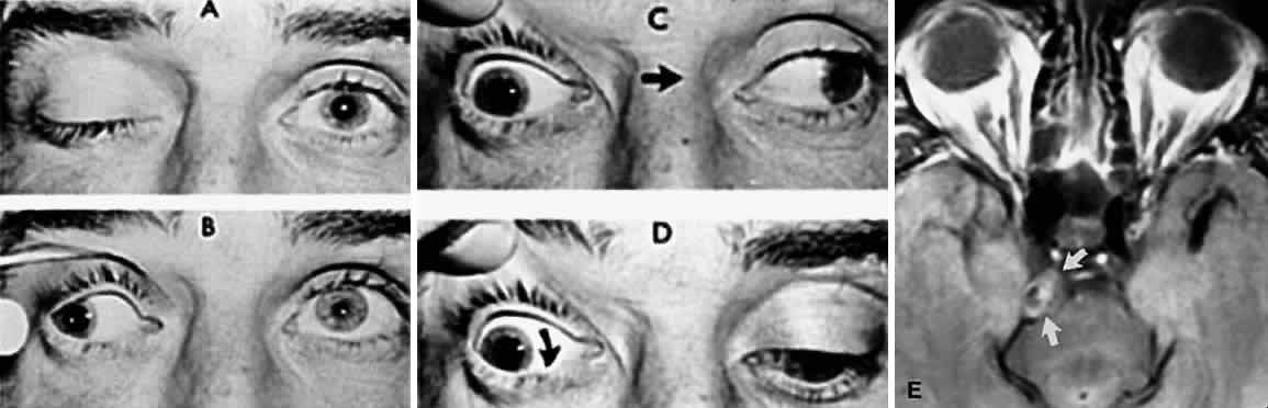 When pain persists and all radiologic and orbital investigations are unrevealing, a trial of corticosteroids (e.g., 60 mg prednisone orally for 5 days) may result in prompt and dramatic relief, in which case a tentative diagnosis of nonspecific inflammation of the superior orbital fissure or cavernous sinus may be made. However, the “response to steroid trial” may produce relief of pain with neoplasms as well as inflammation (see below, Combined Ocular Motor Palsies and Painful Ophthalmoplegia). Certainly, unrelenting eye or orbital or facial pain is an indication for exquisite visualization of the cavernous sinus and parasellar area by thin-section MRI scanning and either magnetic resonance or conventional angiography, if vascular abnormalities are suspected. Isolated sixth nerve palsies in children often resolve spontaneously. Newborns may rarely manifest a transient lateral rectus weakness, with resolution occurring by 6 weeks.28 Knox and colleagues29 called attention to transient isolated abducens palsy of presumed postviral origin developing in children 1 to 3 weeks after nonspecific febrile or respiratory illness. The age range of the patients reviewed was 18 months to the early teens; recovery of abducens function occurred within 10 weeks (one case continued for 9 months). A similar pattern may be seen with specific viral illnesses such as varicella,30 after immunization,31 or in association with Epstein-Barr viremia.32 A spate of reports indicates that some patients have multiple recurrences of these isolated “benign” sixth nerve palsies and that these recurrences have no serious implications.31,33–36 A 35-year-old with cluster headaches also experienced three consecutive right lateral rectus palsies, on each occasion beginning a day or two after onset of pain, with recovery within 2 weeks37; radiologic studies were unremarkable, suggesting the possibility of migrainous abducens palsy. Robertson and co-workers38 found a high incidence of brain tumor in his Mayo Clinic series of children with sixth nerve paresis. Although referred to as cases of “isolated” sixth nerve paresis, this definition signifies only that no other ocular motor nerves were defective. Indeed, of the children with neoplasms, one-third had papilledema and one-half demonstrated nystagmus at the time of initial examination. Of the patients with tumor who truly presented with only isolated abducens palsy, additional signs appeared within a few weeks or, rarely, within 2 to 3 months. Harley,39 in his series of children with sixth nerve palsies of all causes, whether isolated or not, noted that approximately one third had suffered trauma and one fourth had underlying tumors; the total clinical picture in these cases is not described. In the child with an isolated sixth nerve palsy without other neurologic signs, including papilledema, headaches, or ataxia, the following approach is suggested: (1) rule out middle-ear infection; and (2) obtain a peripheral blood count (lymphocytosis may be considered an indication of recent viral infection). The child must be reexamined at regular intervals until the paresis clears, and the parents must be advised to observe for new signs or symptoms. If the paresis persists or worsens, MRI is mandated. A persistent sixth nerve paresis in childhood may be the first clinical sign of a pontine astrocytoma or other posterior fossa mass lesion. In a 10-year series of 49 “younger adults” (age range, 15 to 50 years) with isolated sixth nerve palsy, Moster and colleagues40 reported that about one third had diabetes and/or hypertension; 8 had basal tumors; 6 had isolated abducens palsies as the initial sign of multiple sclerosis (all with subsequent clinical or spinal fluid abnormalities), usually with spontaneous resolution; and 11 had no specific etiology disclosed, but did have a sanguine outcome. This series excluded patients with a positive Tensilon test, abnormal forced ductions, other known neurologic disease, or with bilateral palsies. Larger series of sixth nerve palsies reported41–43 are helpful in reviewing the causes, although these patients were somewhat preselected. The largest number of cases fell into the nonspecific “vascular” category (37%, 7%, and 18%, respectively) and the “undetermined” category (24%, 21%, and 29%, respectively). All three series included a modest number of patients with multiple sclerosis (13%, 7%, and 4%, respectively; also 12% in the Moster40 series), but abducens palsy in demyelinative disease has been exceedingly rare in our personal experience. Nevertheless, with the advent of MRI, acute sixth nerve palsies with multiple sclerosis may be more frequently discovered, with abnormal signals in the pons.44 Minimal abduction paresis may herald increased intracranial pressure, such that the patient complains of horizontal diplopia when viewing distant objects. Clinically, these symptoms and findings may mimic divergence insufficiency. Kirkham and co-workers,45 using electro-oculographic techniques, have demonstrated reduced abduction saccadic velocities, which suggest bilateral minimal sixth nerve dysfunction. Although neurons that discharge with divergence (and convergence) have been found in the mesencephalic reticular formation of the monkey,46 the existence of a “divergence center” in the brain stem still remains controversial. Symptomatic treatment of an acute sixth nerve palsy includes the use of Fresnel prisms, or alternate patching to avoid diplopia and possible medial rectus contracture. The injection of botulinum toxin type A (Botox) into the ipsilateral medial rectus is quite effective at preventing muscle contracture and improving fusion in the primary position of gaze. However, this procedure carries the disadvantage of significant crossed diplopia (exotropia) in contralateral gaze. Definitive surgical correction of a sixth nerve paresis should be employed when the deviation has been stable for at least 6 months