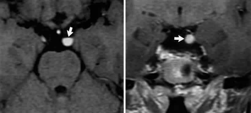 FASCICULAR LESIONS Deficits of the oculomotor fasciculus are usually identified by the accompanying brain stem signs. Oculomotor palsy with contralateral hemiplegia (Weber syndrome) indicates involvement of the corticospinal tracts. Contralateral ataxia and intention tremor (Benedikt syndrome) indicates involvement of the red nucleus (see Fig. 2). Nothnagel syndrome is an eponym given when signs of both Weber and Benedikt syndromes are present. Midbrain vascular accidents account for most fascicular defects. Ksiazek84 shed some light on the fascicular arrangement of the oculomotor nerve based on two patients with partial oculomotor paresis, each with pupillary mydriasis, significant inferior rectus paresis, and medial rectus paresis. Neuroimaging revealed a lesion in the fascicular portion of the nerve, thus indicating the proximity of these fibers in the fasciculus. Monocular elevator paresis (superior rectus and inferior oblique) in mass compression of the oculomotor fasciculus has also been reported.85 In this regard, Castro and associates86 proposed the mediolateral somatotopy of the oculomotor fascicular fibers within the mesencephalon with the inferior oblique and superior rectus muscles being most lateral, and the pupilloconstrictor fibers and inferior rectus being most medial. The levator palpebrae fascicles are in an intermediate location between the superior rectus and medial rectus fascicles. INTERPEDUNCULAR LESIONS Basal lesions, including the rare rostral basilar artery aneurysm, may encroach on the oculomotor nerves as they exit in the interpeduncular space. Such slow-growing aneurysms, either saccular or fusiform, may present as partial oculomotor palsies with or without involvement of pyramidal tracts, and without subarachnoid hemorrhage.87 Aneurysms of the posterior communicating artery, on the other hand, are probably the most common lesions causing acute spontaneous oculomotor palsies (Fig. 12). According to Hyland and Barnett,88 the oculomotor palsy that occurs with posterior communicating aneurysm is not necessarily due to mass effect per se, but rather is attributed to hemorrhage that suddenly enlarges the aneurysmal sac to which the oculomotor nerve is adherent, or to hemorrhage into the substance of the nerve itself. Most patients present, therefore, with an intensely painful, complete unilateral oculomotor palsy in association with other signs and symptoms of subarachnoid hemorrhage. Few patients with symptomatic posterior communicating aneurysms are found in office waiting rooms: they are usually obtunded or comatose in emergency rooms. Involvement of pupillary fibers is such a consistent finding in third nerve palsies due to bleeding aneurysms that most clinicians concur in this useful dictum: a pupil-sparing, but otherwise complete, third nerve palsy is very unlikely to be due to posterior communicating aneurysms. Careful pupil evaluation may disclose subtle abnormalities in “apparent pupil-sparing,” especially in cases of aberrant regeneration or with chronic cavernous sinus lesions. Generally, in patients at least 50 years of age or older, an acute, isolated, painful oculomotor palsy that spares the pupil is caused by intraneural ischemia; nevertheless, these patients must be carefully observed for further evolution. In our opinion, an acute complete oculomotor palsy with moderate to major mydriasis, even when diabetes is present, is an indication for cerebral arteriography. It should be emphasized that magnetic resonance angiography may not detect aneurysms smaller than 3 to 4 mm.89 The clinical management of patients with relative pupil-sparing third nerve palsies remains in debate. Observation alone arguably is appropriate management of such patients; however, since practically every conceivable combination of partial ophthalmoplegia and pupillary abnormality has been reported in aneurysmal compression of the third nerve, it is better to err on the side of caution and perform angiography more frequently. It is incumbent upon the physician to evaluate carefully the proportion of ophthalmoplegia and ptosis in relation to the degree of pupillary abnormality when deciding appropriate workup of these patients. Again, the increasing sensitivity of magnetic resonance angiography has not yet entirely replaced formal angiography. Certainly, neurosurgical intervention requires conventional cerebral arteriography before surgical treatment. Capó and colleagues90 pointed out that the interval from onset to maximal ophthalmoplegia does not differentiate between microvascular (3.3 days) and aneurysm (3 days), but that failure to recover within 4 to 8 weeks requires further evaluation. Other partial oculomotor palsies occur regularly with cavernous sinus masses and parasellar syndromes (see below), accompanied by variable pupillary findings. Furthermore, both acute and chronic lesions may produce incomplete palsy of the superior division (supplying levator palpebrae and superior rectus muscles) or of the inferior division (medial and inferior recti, inferior oblique and pupillomotor fibers). If pain or first trigeminal division numbness are absent, and if the pupil is uninvolved, such fractional oculomotor pareses are regularly misinterpreted as myasthenia or local orbital inflammations. Guy et al91 described five patients with isolated ptosis and elevator paresis in abduction, consistent with selective “superior division” involvement. They also discussed five previously reported cases with the following respective diagnoses: (1) intracavernous aneurysm (usually with associated Horner's syndrome) and basilar artery aneurysm; (2) diabetic ophthalmoplegia; (3) meningitis; (4) dural lymphoma; and (5) postsurgical manipulation of parasellar structures. In essence, there was little anatomic correlation with the physical separation into superior and inferior oculomotor trunks that occurs in the cavernous sinus. Moreover, two patients sustained superior division palsie