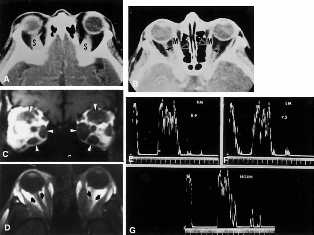 Commonly, torsional movements of the globe are observed on attempted horizontal or vertical versions (see Fig. 29A and B). For example, on attempted right gaze, the right eye abducts incompletely and extorts slightly as it reaches the position of maximum abduction. This excyclotorsion is seen especially in the company of elevation deficits (tight inferior rectus). In the early stages of the disease, an affected muscle may in rare cases appear paretic rather than restricted. Hermann251 reported on two patients with diplopia with negative forced ductions, but with saccadic velocities consistent with inferior rectus paresis. We also have observed a patient with obvious Graves disease who presented with an inferior rectus paresis, including a positive three-step test and negative forced ductions; echography revealed a greatly enlarged inferior rectus muscle. Several months later the hypertropia converted to a hypotropia, as a typical restrictive pattern evolved. Such paresis is distinctly unusual, and may represent thyroid “myositis” as a precursor to muscle fibrosis. However, mechanical restriction by the involved muscle with positive forced duction testing is the rule. An additional clue to the restrictive nature of TRM is the finding of elevation of intraocular pressure on attempted upward gaze.252 This phenomenon, attributed to a fibrotic and taut inferior rectus muscle, may aid in establishing the cause of otherwise puzzling spontaneously acquired diplopia. The diagnosis of TRM is not so difficult a task on clinical grounds, if the physician bears in mind the characteristic lid and orbital congestive signs, the typical patterns of motility disturbance, and the use of the forced duction test. Increase in extraocular muscle bulk, the hallmark of Graves orbitopathy, may be assessed by standardized A-scan ultrasonography,253 CT scanning, or MRI (Fig. 30). Usually multiple muscles in both orbits are enlarged, but asymmetry may be striking. To affirm the diagnosis in terms of biochemical tests of thyroid function is another problem altogether. Ocular manifestations may antedate laboratory or clinical evidence of dysthyroidism, but many patients present with ophthalmologic complications occurring months to years after surgery or radioactive iodine therapy for hyperthyroid states. At the time of ocular diagnosis, many of these patients are euthyroid by all parameters of multiple laboratory tests of thyroid function. However, hypothyroidism with elevated thyrotropin (thyroid-stimulating hormone, TSH) levels after radioactive iodine treatment appears to be an important adverse risk factor for development or exacerbation of ophthalmopathy.254 In addition to a history and physical examination, laboratory procedures to determine triiodothyronine (T3), thyroxine (T4), TSH, and T3 resin uptake have assumed a fundamental role. T4 and T3 are the major circulating hormones produced by the thyroid. By increasing the sensitivity of analysis, radioimmunoassay (RIA) techniques have dramatically simplified thyroid hormone assessment. Furthermore, T3 (RIA) and T4 (RIA) levels are not influenced by inorganic iodine contamination from outside sources. Hence, the administration of iodinated radiologic contrast dye does not confound the evaluation of thyroid function when RIA methods are employed. Both the T4 (RIA) and the previously widely used T4 measurement by the Murphy-Pattee competitive protein-binding assay require simultaneous T3 resin uptake determination. The T3 resin uptake analyzes the unbound thyroxine-binding globulin. Numerous conditions (e.g., pregnancy, hepatitis, recent surgery, renal failure) and pharmacologic agents (e.g., estrogens, corticosteroids, phenytoin) may alter thyroxine-binding globulin affinity; therefore a computed value, the free T4 index, is often used to estimate the amount of free thyroid hormone available to the tissues. The free T4 index is calculated from the serum T4 concentration and the T3 resin uptake. Although T3 thyrotoxicosis is well recognized by internists and endocrinologists as a distinct clinical entity, ophthalmologists must be aware that T4 determination alone does not completely evaluate peripheral blood thyroid hormone status. In addition, T3 is often elevated out of proportion to T4 in Graves disease. Long-acting thyroid stimulation determinations, although still available, have no currently recognized value in diagnosis or patient care. Since approximately two thirds of patients with euthyroid Graves disease demonstrate an autonomously functioning pituitary-thyroid axis, this homeostatic system must be evaluated. An autonomous pituitary-thyroid axis indicates that the thyroid gland has escaped the normal feedback, regulatory control of circulating TSH; it is thus known as the autonomous thyroid gland. For many years, the Werner suppression test was employed to assess any “escape” of the thyroid from normal TSH control. This test involved the administration of oral T3 (Cytomel) for 7 days with prior and follow-up determination of radioactive iodine uptake detected over the thyroid gland. With disruption of the pituitary-thyroid balance, the administration of oral T3 fails to suppress radioactive iodine uptake below 50% of the initial level, thereby indicating autonomous thyroid activity (provided that the initial uptake is at least 15%). The intravenous thyrotropin-releasing hormone (TRH) test has now virtually supplanted the more cumbersome, time-consuming, and costly Werner suppression test. TRH is the hypothalamic regulatory factor controlling the release of TSH from the anterior pituitary gland. Normally, intravenous administration of TRH causes a four- to five-fold peak rise in blood TSH level within 20 to 30 minutes after injection. The TSH response to TRH is fairly constant, except in patients with Cushing's syndrome from either endogenous or exogenous excess corticosteroids. In addition, patients with an autonomous pituitary-thyroid axis will
