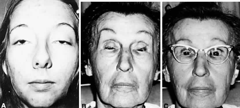 Clinically, PEO is characterized by insidiously progressive, symmetric immobility of the eyes, which are fixed to oculocephalic or caloric stimulation. There is no pain and the pupils are spared, but the lids typically are ptotic and the orbicularis oculi weak (Figs. 31 and 32). Unlike Graves' ophthalmopathy, there is no lid retraction, proptosis, or congestive conjunctival signs. In longstanding PEO, however, fibrotic changes in extraocular muscles may produce mechanical resistance and a positive forced duction test. Chronic or “fixed” ocular myasthenia may be confused with PEO, because both disorders tend to demonstrate the following: symmetric total or subtotal external ophthalmoplegia; ptosis; normal pupils; orbicularis oculi, facial, and bulbar weakness; and resistance to Tensilon or other cholinergic agents. A slowly progressive symmetric ophthalmoplegia, without fluctuations or remissions, speaks strongly in favor of PEO (see below, hereditary form). Otherwise, electrophysiologic testing and muscle biopsy may be required to distinguish between chronic myasthenia and PEO.