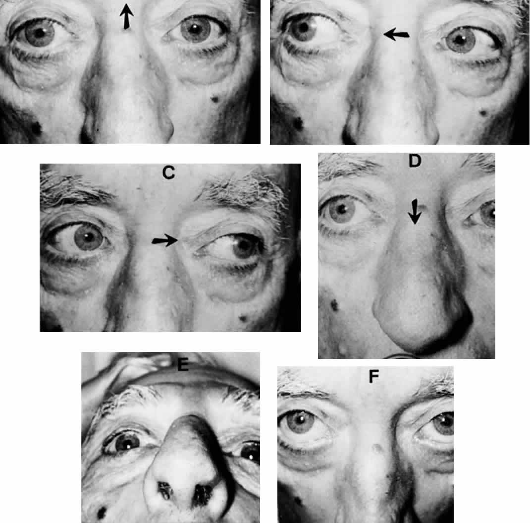 paresis of pupillary constriction and accommodation. Upward gaze is typically affected, with preservation of downward movement (Fig. 35). The vertical palsy is supranuclear, and doll's head maneuver or Bell's phenomenon should elevate the eyes; however, eventually all upward gaze mechanisms fail. Skew deviation may be present, accounting for vertical diplopia. Attempts at upward saccades produce variable degrees of retraction-convergence nystagmus, in bursts or sustained. Retraction of the globe is especially evoked by downward rotation of optokinetic targets (saccadic phase upward). Accommodative spasms also occur on attempted upward gaze, and these episodes of momentary myopia may presage other signs and symptoms. Ultimately, accommodative paresis ensues, and pupils become mid-dilated and show light-near dissociation302 (see Fig. 35). There may be spasms or paralysis of convergence and “pseudoabducens palsy”: that is, slower movement of the abducting eye than the adducting eye during horizontal saccades can also be observed.
