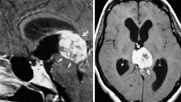 Pinealomas are the most common lesion producing the “Parinaud-plus” syndrome (Fig. 36). Mass lesions involving the periaqueductal gray matter may arise in the posterior third ventricle, quadrigeminal plate (tectum), supracollicular subarachnoid space, or falco-tentorium. As the aqueduct becomes obstructed, internal hydrocephalus develops, and headache and papilledema appear. In addition to neoplasms, vascular occlusions, trauma, extra-axial and intra-axial arteriovenous malformations, demyelination, giant aneurysms of the posterior fossa, infections, trauma, stereotactic surgery for pain, and hydrocephalus from various causes have all been associated with the dorsal midbrain syndrome. Paralysis of upgaze can be an early sign of malfunctioning of a shunt placed to treat hydrocephalus, and it is reversible with repair or replacement of the shunt. Also, a reversible dorsal midbrain syndrome has been observed after jejunoileal bypass for obesity.303 CNS toxoplasmosis in AIDS patients has now become an important cause of Parinaud syndrome as well.304 A single case of Parinaud syndrome has been described in association with Leber's hereditary optic neuropathy.305 Vertical supranuclear ophthalmoplegia has been associated with metabolic disorders, including certain lipid storage diseases such as Niemann-Pick type C,306,307 which may present in adults as dementia and ataxia.308 The Niemann-Pick variant is characterized by sea-blue histiocytes in the bone marrow and visceromegaly. Ocular motor abnormalities include loss of voluntary vertical saccades, especially downward; loss of the fast phase of optokinetic nystagmus; defective convergence; and substitute “head-thrusting.” Pathologically, lipid storage has been demonstrated in numerous ocular tissues, but ophthalmologic changes are observed only in later life, when the optic nerves appear pale and the perimacular areas show gray discoloration.309 Final clinicopathologic correlation is lacking, but clinical features suggest diffuse involvement of cortical gray matter, basal ganglia, cerebellum, and upper midbrain, where corticobulbar ocular motor fibers may be preferentially involved in the subthalamic and pretectal regions. Other forms of ophthalmoplegia are present in Wilson's disease,310 kernicterus,311 and barbiturate overdose.312 |