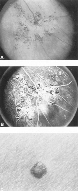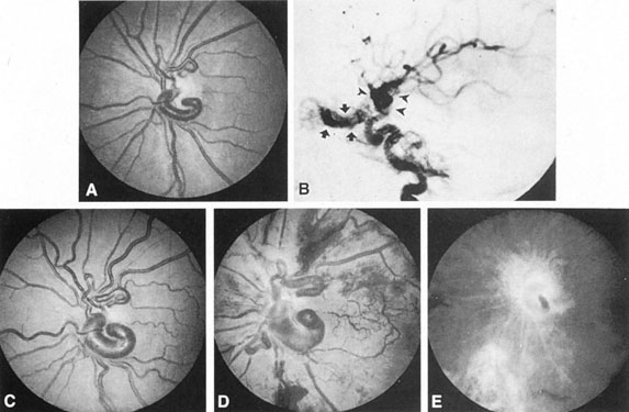 CAVERNOUS ANGIOMAS OF RETINA AND BRAIN Certain disorders link congenital vascular anomalies of the eye and brain, including familial cavernous angiomas of the retina and central nervous system, more commonly in the supratentorial space than posterior fossa. As a rule this syndrome is transmitted as an autosomal dominant trait and is characterized by seizures, headache, and intracranial hemorrhages.183,184 Gass185 believes that the retinal lesion is a vascular hamartoma (i.e., a cavernous hemangioma), but not an angiomatosis retinae, retinal telangiectasia, or racemose angioma. The lesion appears as a “cluster of saccular aneurysms filled with venous blood” at the nerve head or midretina (Fig. 29). Such cases are variably associated with small cutaneous angiomas, and bilateral retinal involvement has been documented as well as familial occurrence.186 Neither retinal nor cerebral lesion need be symptomatic. Rigamonti and associates184 have demonstrated the superiority of MRI over CT in discovering the cerebral angiomas, characterized by small-caliber feeding vessels with slow circulation and thrombosis. In general, it should be recognized that there is a wide and confounding spectrum of both hereditary and nonfamilial neurocutaneous angiomatoses, including various AVMs or hemangiomas of the skin and ocular fundus, associated with AVMs and venous anomalies of the brain. Leblanc et al187 suggested a useful classification of vascular neurocutaneous syndromes (Table 2). Fortunately, MRI and magnetic resonance venous angiography have evolved as practical and precise techniques in elucidating occult cerebral lesions and at least serve as preliminary studies that direct decisions for more elaborate selective arteriography. TABLE 2. Vascular Neurocutaneous Syndromes