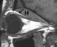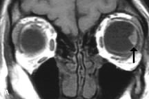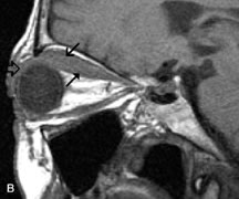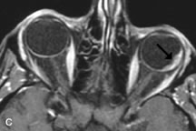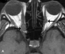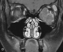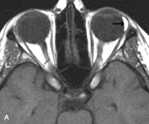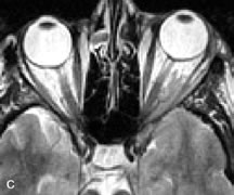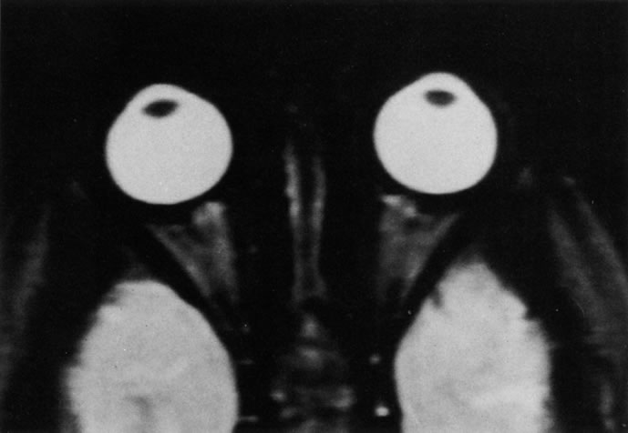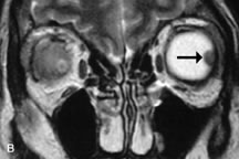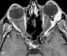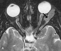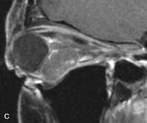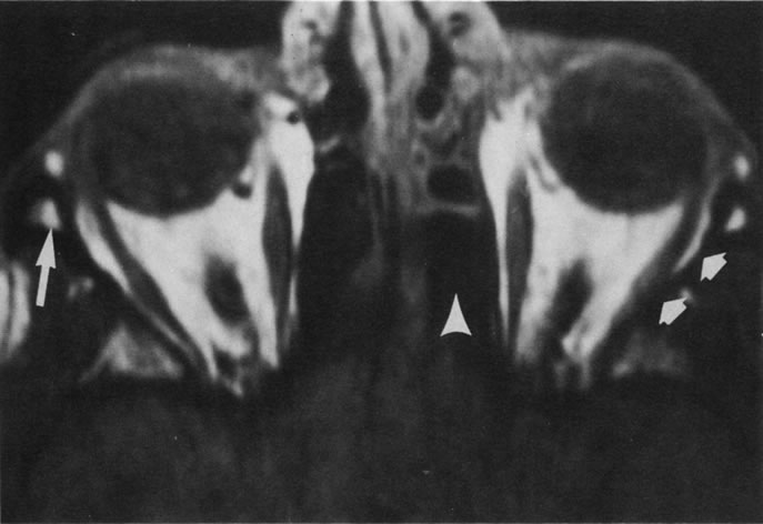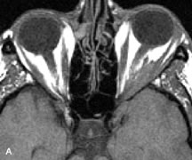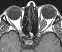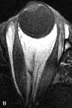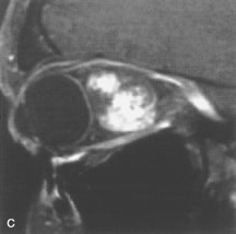 PATIENT PREPARATION Before MRI is performed, patients must be screened and prepared to avoid the potential hazards associated with the strong magnetic field. Patients who have ferrous aneurysm clips or cardiac pacemakers, who depend on life-support equipment, or who retain a possible metallic intraocular foreign body are not candidates for this imaging modality. MRI cannot be performed on obese patients who cannot fit into the bore of the magnet. Patients who are claustrophobic may not tolerate a prolonged period of study within the confines of the magnet, whereas others might do well if given a mild sedative. All worn metallic objects (e.g., necklaces, watches) should be taken off, credit cards set aside, and eye makeup removed before entering the room containing the magnet.5,20,34,35,36 NORMAL ORBITAL ANATOMY T1-weighted images provide the best anatomic details of the orbit because they display superior contrast resolution between normal structures (see Fig. 8). The vitreous has a long T1, resulting in an intermediate signal similar to brain, whereas the crystalline lens and sclera appear dark because of a longer T1 and short T2. The extraocular muscles, like all skeletal muscles, demonstrate a moderately long T1 and short T2 and highly contrast with the intense signal of the surrounding orbital fat (adipose tissue has an extremely short T1). The lacrimal glands appear as mottled areas of reduced intensity of the signal from the orbital fat in the lacrimal fossa. The optic nerves are seen with the same signal intensity as brain white matter and are hypointense relative to the orbital fat because their Tl is longer than the Tl of fat but shorter than the Tl of water. Cortical bone is not well delineated because it contains little free water, yielding minimal signal in MRI, and thus appears dark on all pulse sequences. This feature explains why MR images of the orbital apex and intracanalicular portion of the optic nerves are superior to comparable CT scans. Partial volume averaging of the bones in these regions obscures soft tissue details on CT images, whereas MRI reveals the signals only from the soft tissue structures with no cortical bone input. Bone marrow, on the other hand, is seen as a relatively intense signal because of its high fat content (see Fig. 8).37,38 T2-weighted pulse sequences are not ideal for imaging normal anatomy; however, they are particularly useful in revealing pathologic conditions (see Fig. 9). T2-weighted studies are most easily recognized by a bright vitreous signal. ORBITAL DISEASES Vascular Lesions Cavernous hemangiomas appear as well-circumscribed, smooth, usually intraconal masses that are isointense to muscle on T1-weighted images and hyperintense on T2-weighted images (Fig. 12). Patchy early enhancement is typically followed by diffuse, more homogeneous enhancement.39 The internal architecture of the mass, including septation and internal vasculature, may often be appreciated with high-quality orbital imaging.40 Lymphangiomas consist of ectatic vascular channels within a connective tissue stoma with varying degrees of lymphoid cellularity. On MRI, these tumors are typically poorly circumscribed, multicompartmental, and heterogeneous, often showing cystic dilations with fluid levels (Fig. 13). The signal characteristics within lymphangiomas vary considerably, reflecting cystic and solid components and the varying paramagnetic characteristics of blood at different stages of degradation.40–42 Acute hemorrhage appears hypointense on both T1- and T2-weighted formats. Methemoglobin present in subacute hemorrhage (3 to 14 days) leads to hyperintense signal on both T1- and T2-weighted images.41 A small percentage of lymphangiomas appear radiologically indistinct from orbital cavernous hemangiomas.43 Orbital varices are venous malformations that expand with increased systemic venous pressure, such as with Valsalva maneuvers. Because rapid acquisition of images during a Valsalva maneuver is important in imaging such a lesion, conventional or spiral CT is currently the modality of choice.44 MRI is an excellent modality for demonstrating enlargement of the cavernous sinus and dilation of the superior ophthalmic vein in patients with high-flow carotid-cavernous fistulas (Fig. 14).37MRA may be helpful in the evaluation of the venous outflow pattern. The rapidly flowing blood in these vascular structures carries the excited protons out of the section before they can be imaged, resulting in their dark appearance.5 In low-flow dural arteriovenous malformations, MRA may help define the arterial feeding vessels.45 Neural Lesions MRI is more effective than CT in delineating the intracranial optic nerves, chiasm, and optic tracts and, for this reason, is the preferred imaging modality in the evaluation of optic nerve disorders. The spatial relationships and image contrast of the orbital tissues with intraorbital optic nerve tumors is comparable between the two imaging modalities. The normal nerve is isointense to brain and appears enlarged and kinked owing to infiltration of an optic nerve glioma on T1-weighted images. Gliomas appear hyperintense on T2-weighted images and may be heterogeneous owing to cystic areas within the tumor. Contrast enhancement is variable.46 Intraorbital and intracranial optic nerve sheath meningiomas are usually isointense to cortical gray matter on Tl-weighted images and remain isointense on proton density studies (Fig. 15). Gd-DTPA is useful in delineating the intracranial extension of optic nerve meningiomas.7,47 The hyperostosis of bone and calcification associated with meningiomas are not demonstrated as well on MRI studies as on CT scans.20,37 Gd-DTPA–enhanced MRI also appears promising in the study of the permeability of the blood–brain barrier in selected optic neuropathies.22,48 MRI may reveal an enlarged optic nerve and some degree of contrast enhancement in cases of optic neuritis.49 Muscle Disorders Extraocular muscle enlargem