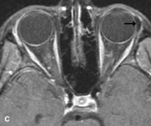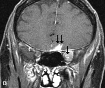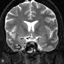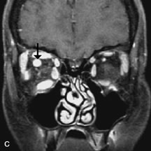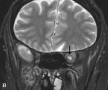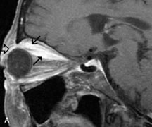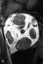 of making promising contributions to the study of disease. SPECTROSCOPY Localized in vivo spectroscopy uses MRI technology to analyze the physiochemical processes of body tissues. Ions of hydrogen, carbon, sodium, and phosphorus can provide information about the physiology, biochemistry, and metabolism of normal and disease states. Very strong magnetic fields are necessary to process the weak signals emitted by these nuclei, which are in relatively small concentrations. This information may be presented by either quantitative graphic representation or two-dimensional slice images. Hydrogen spectroscopy is currently in widespread use for evaluation of brain disease. Its use in the orbit is hindered by the relatively low spatial resolution and artifacts related to bone and air surrounding the orbit.37,90,91 Thus far, there has been limited investigational use of carbon, sodium, and phosphorus spectroscopy for evaluation of central nervous system pathology because of the relatively low abundance of these substances in the tissues as compared with hydrogen atoms. Its use for evaluation of orbital disease has not yet been established. This noninvasive method of studying disease has the potential to help differentiate certain pathologic processes and their response to therapy in the future. For example, the sodium ion plays a major part in the initiation of mitosis and the maintenance of cellular proliferation; thus, sodium MR images have demonstrated an increased sodium signal in malignant tumors. Phosphorus-containing compounds, such as adenosine triphosphate, are involved in numerous metabolic processes and may provide information about intracellular pH, tissue metabolic rates and energy states, and the concentration of particular metabolites.20,37,92 CINE–MAGNETIC RESONANCE IMAGING A new method called cine-MRI uses gradient-echo images acquired in short millisecond scan times providing information about blood and cerebrospinal fluid flow in the spine and brain. Abnormal flow patterns of cerebrospinal fluid have been identified in patients with Chiari I malformations and syringomyelia.93 Cine-MRI can also be used to dynamically observe extraocular muscle movements. These images typically have lower spatial and contrast resolution than conventional scans, however. NEW CONTRAST AGENTS Although Gd-DTPA is the only currently available contrast agent for clinical MRI, other classes of agents are being investigated. Paramagnetic-labeled monoclonal antibodies and pharmaceuticals appear promising for studies of immunology, physiology, and pharmacology.20 Particulate iron oxide agents may provide new information about the reticuloendothelial system.29 |