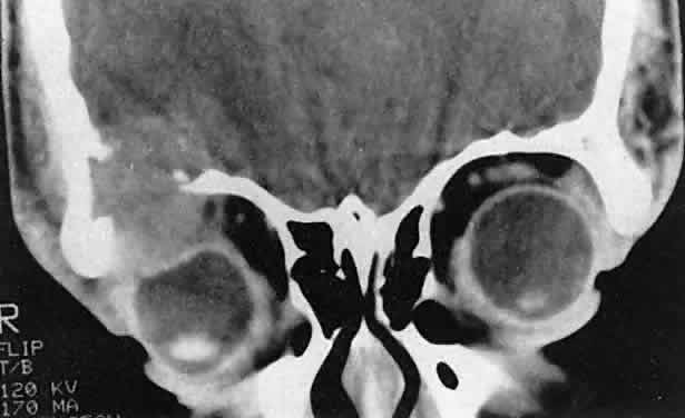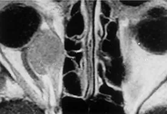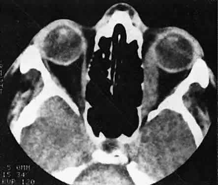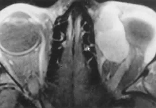 The general management of these disorders varies widely. In most of the malignant conditions, a prompt tissue diagnosis is followed by systemic evaluation and definitive multimodal therapy by a team skilled in pediatric oncology. In these cases, the preferred surgical approach for the biopsy may vary with the suspected tumor. For a lymphangioma with recent hemorrhage, the diagnosis might be established on clinical grounds and the patient observed, or intervention might be restricted to simple evacuation of blood cysts without attempts at major resection. For a dermoid cyst, complete excision without violation of the tumor capsule is the goal. For a capillary hemangioma, the clinical diagnosis generally is followed by simple observation without surgical intervention. In inflammatory processes, the diagnosis also is based on clinical evidence, and anti-inflammatory measures are initiated. Distinctions between infectious and idiopathic inflammations are necessary in choosing the appropriate medications. Although these conditions are addressed individually elsewhere in this text, they are presented briefly and in juxtaposition here, because it is apparent that some informed distinctions must be made promptly at the time of initial presentation. Although we briefly discuss treatment, the emphasis of this chapter is on the features that might lead to a provisional diagnosis. There are marked differences in the frequency of these disorders,1 but they do not reflect the clinical importance of any individual lesion. Statistical frequencies are also of less value in the diagnosis of any individual case than are careful analysis of the history, physical findings, imaging tests, and histopathologic samples. Computed tomography (CT) remains the first-line diagnostic test in most cases of proptosis. The topographic features shown by CT should narrow the differential diagnosis. Magnetic resonance imaging (MRI) can provide additional diagnostic information by exploiting different physical properties of the lesion compared with CT. For example, lesions that are isodense with normal structures by CT may not be isointense by MRI. In selected cases, orbital echography may further reduce the diagnostic choices by providing information about the lesion's internal architecture. |