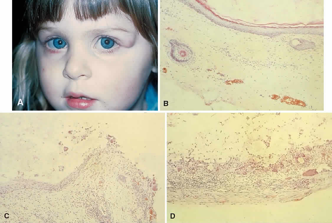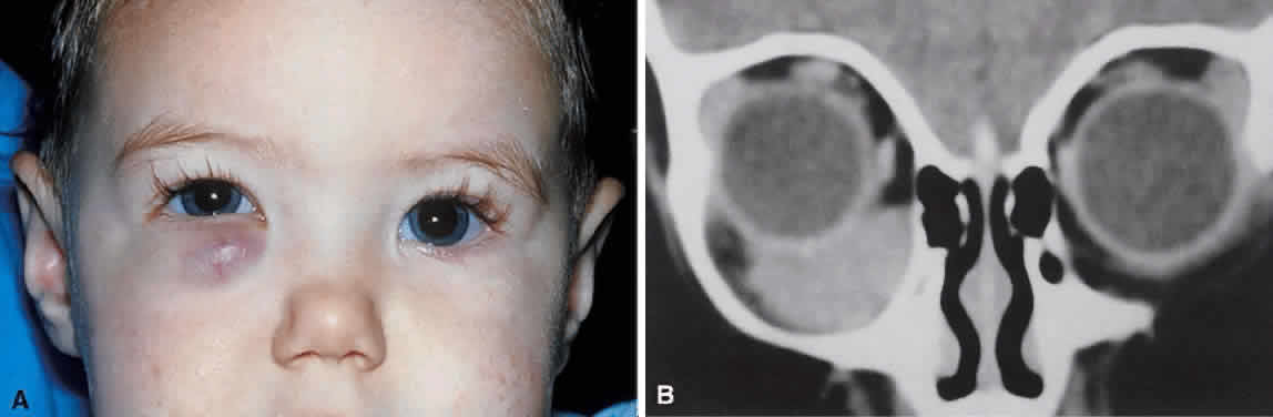 The intimate association of orbital lymphangiomas with structures critical to normal vision makes their complete excision almost impossible without incurring vision loss. Because their vascular components do not actively proliferate, the response to radiation therapy is limited and probably is proportionate to whatever lymphoid tissue is present. The presence of a blood cyst is not in itself an indication for treatment if vision is not impaired. In many cases, the blood resorbs during several weeks without residual problems. Frequently, however, vision is compromised by the sudden expansion of multilobulated cysts that surround the optic nerve, and simple observation may result in permanent deficits. Treatment requires evacuation of the offending cysts in a conservative manner consistent with preservation of vision.84 Because the channels of a lymphangioma are hemodynamically isolated from the systemic circulation (“no flow anomalies”),63 their surgical decompression does not produce brisk new bleeding from within them. Rather, the hemorrhagic risk of surgery involves intraoperative and, more often, postoperative, intrinsic bleeding, creating new blood-filled macrocysts.62 Conservative surgery restricts intraorbital manipulation, involves evacuation of offending blood cysts, and avoids disturbance of nonexpanded portions of the lymphangioma. Extensive dissection for cosmetic purposes should be undertaken with the same respect for the fragility of nonexpanded channels. TRAUMATIC ORBITAL HEMATOMA Although the diagnosis of a traumatic orbital hematoma would seem obvious on the basis of history alone, some element of trauma within a few days of the onset of proptosis is such a common historical finding among small children that it may have little differential value. Conversely, a history of culpable trauma may not always be forthcoming, as in cases of child abuse. In penetrating orbital injuries, the entry wounds suggest the diagnosis. Retained foreign bodies should be ruled out. In blunt injuries, other diagnostic clues are helpful. Ecchymosis may be present but also may be a feature of granulocytic sarcoma, neuroblastoma, or lymphangioma with recent bleeding. CT may show an associated fracture. Most orbital hematomas that result from blunt injury occur in the potential subperiosteal space (Fig. 18). The lack of adjacent sinus opacification and the absence of systemic toxicity differentiate this entity from a subperiosteal abscess, which can have a similar appearance.59 Echography shows the low acoustic reflectivity characteristic of fluid-filled spaces. If a traumatic orbital hematoma has compromised vision by acutely elevating orbital pressure, the pressure should be reduced promptly with a lateral canthotomy and cantholysis. If, conversely, vision is compromised because of extreme globe displacement and optic nerve attenuation, the hematoma should be evacuated.87 This is a relatively simple procedure if the blood is compartmentalized in the subperiosteal space. We favor a lid crease incision, with dissection between orbicularis muscle and orbital septum to the orbital rim. The subperiosteal space is then entered, and the hematoma is evacuated. If vision is not compromised, patients can be treated conservatively. Spontaneous absorption generally follows, but hematomas occasionally enlarge with osmotic imbibition. DERMOID CYST Dermoid and epidermoid cysts often occur in the orbit and paraorbital region. Epidermoid cysts are lined by stratified squamous epithelium and are filled with desquamated keratin. The walls of dermoid cysts include dermal appendages that contribute sebum, sweat, and hair shafts to the cyst contents. Both forms probably result from abnormal invagination of surface ectoderm during fetal development. Differences may relate to the depth of tissue that has been sequestered or to the degree of ectodermal differentiation at the time of inclusion.88 Most dermoid cysts are closely related to bone suture lines, suggesting that the surface ectoderm has been trapped between fusing mesodermal processes. Dermoid cysts are most often encountered at the frontozygomatic articulation but can occur at other suture lines, including those deep in the orbit. Most lesions are anterior and paraorbital (Fig. 19), located between the orbicularis muscle and the periosteum overlying the orbital rim, and have a fibrous stalk to the suture line. Anterior cysts produce minimal bone change. Other lesions may be entirely intraorbital, causing proptosis and globe displacement. Their expansion produces an overall increase in orbital volume as well as local bone changes (Fig. 20). Dermoid and epidermoid cysts also may be largely intradiploic, with expansion into the anterior cranial fossa, the temporal fossa, or the orbit. Dumbbell lesions may be present with narrow intraosseous components. Anterior, paraorbital dermoid cysts usually are evident soon after birth. Deeper lesions may not declare themselves until mid- or late childhood, or even the adult years. Expansion of the cysts generally is slow and linear, reflecting continuous desquamation of keratinizing epithelium. There may be a point at which the pressure within the cyst inhibits further proliferation and sloughing of epithelial cells, accounting for the clinically observed stability of many lesions. Sporadic enlargement may be caused by hormonally influenced sebaceous gland secretion or by rupture of the cyst wall with a granulomatous inflammatory response to the cyst contents (see Figs. 19B-D). Such episodic change in an otherwise gradual growth pattern places intraorbital dermoid cysts into the current differential diagnosis. Anterior lesions generally are diagnosed and removed without difficulty, although their occasional occurrence near the lacrimal excretory system can complicate treatment.89 Surgeons should strive for excision of an intact cyst, because residual epithelial elements can lead to recurrence. CT examination of deeper le