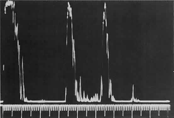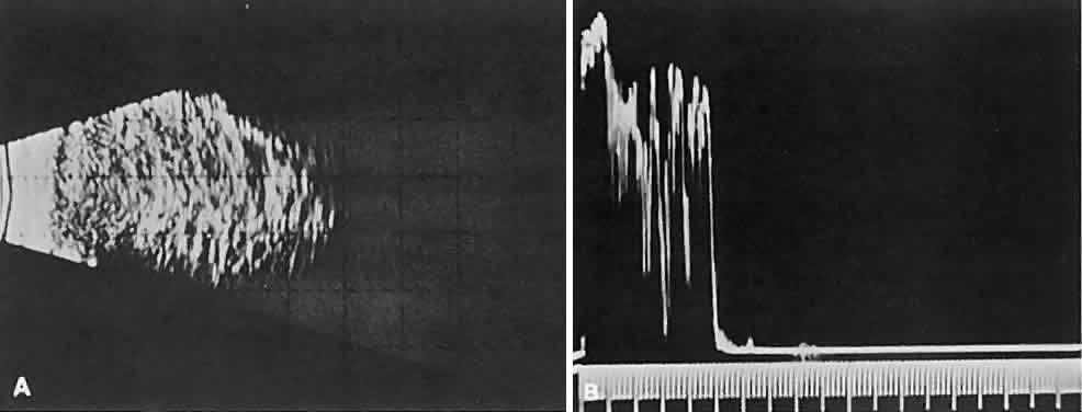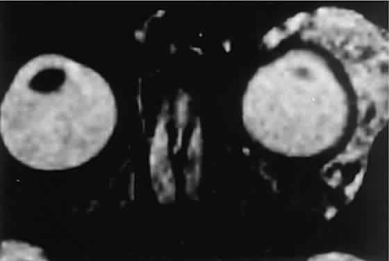 Acute blood cyst formation in this age group makes the distinction between a pre-existent but clinically silent lymphangioma and a rapidly emerging rhabdomyosarcoma a common orbital diagnostic problem. Evidence suggesting an orbitallymphangioma includes the variable finding of conjunctival or eyelid components of the malformation.86 Conjunctival lesions appear as ectatic channels filled with clear or hemorrhagic fluid. Eyelid ecchymosis may result from the seepage of blood out of the thin-walled orbital cysts. Additional developmental anomalies of the eye and adnexa may be present. Other head and neck involvement may be manifest as local hypertrophy (e.g., of the cheek or lips), and cystic palatal lesions may be seen. CT discloses a single or multilobulated mass, which represents only the blood cyst portion of the tumor (Fig. 14). Individual lobules may have different radiodensities depending on the presence of clots or liquefied blood within each cyst (Fig. 15). A generalized increase in orbital dimensions suggests a long-standing, probably congenital process. Echography may help differentiate the cystic components of lymphangioma from cellular rhabdomyosarcoma. Echography shows the blood cysts to be acoustically inactive spaces, with extremely low internal reflectivity (Fig. 16). Clots within the cysts can increase internal heterogeneity, however. MRI has virtually eliminated the need for diagnostic biopsy in this condition, because of its ability to show differing magnetic properties of suspended, degrading blood products (Fig. 17).