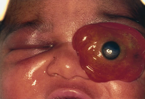 to any surgical intervention. MICROPHTHALMOS AND ANOPHTHALMOS True anophthalmos is a rare condition that results from failure of development or complete regression of the optic vesicle. This condition may be clinically indistinguishable from severe microphthalmos, which results from incomplete invagination of the optic vesicle or closure of the embryonic fissure. The term clinical anophthalmos has been used to describe patients who have no clinical or radiographic evidence of any ocular remnant, although true anophthalmos can only be verified after careful histologic sectioning of the orbital tissues. Anophthalmos and microphthalmos are usually unilateral and may be associated with a variety of craniofacial and systemic anomalies, including orbital hypoplasia, facial clefts, basal encephalocele, hemifacial microsomia, mandibulofacial dysostosis, cardiac anomalies, polydactyly, and mental retardation. When they occur unilaterally, they also can be associated with anomalies of the contralateral “normal” eye, including cataract, cornea1 opacities, microphthalmos, coloboma, epibulbar dermoids, and nystagmus. Anophthalmos and severe microphthalmos frequently are associated with contracted conjunctival fornices, phimotic eyelids, and generalized hypoplasia of the periocular soft tissues (Fig. 1). When soft tissue contractures occur, the early use of conformers is essential to expand these tissues.2 This treatment should be instituted in the first month of life, with progressive enlargement of the conformer over time to achieve maximum expansion of the conjunctival fornix. Unfortunately, this treatment usually does not stimulate adequate orbital bone growth, and unilateral microphthalmos and anophthalmos may be associated with secondary orbital hypoplasia (Fig. 2). Serial implantation of progressively larger orbital implants or placement of expansile orbital implants has been advocated to stimulate bony orbital development.3,4