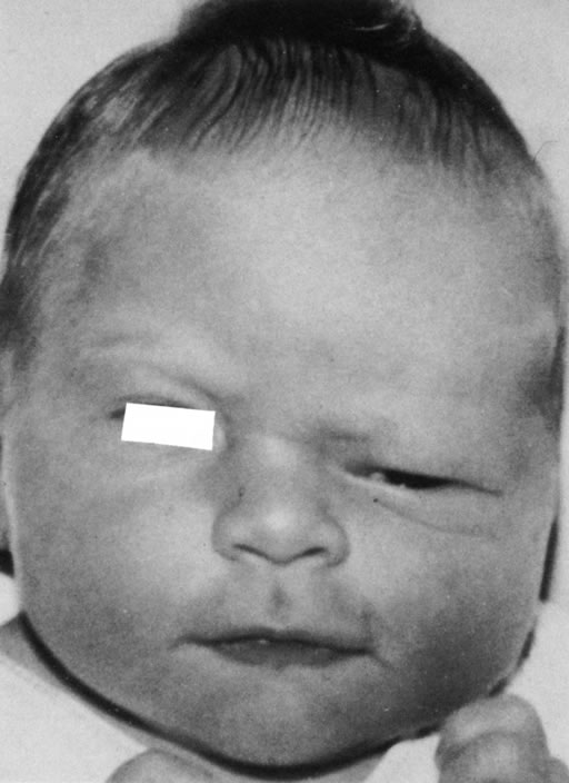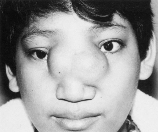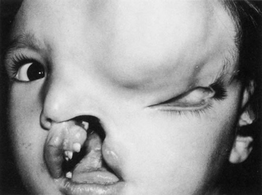 | Congenital defects in the bony sutures of the cranial skeleton may result in a herniation of brain and meninges into the orbit, known as meningoencephalocele (see Fig. 13). This defect is frequently associated with a variety of facial clefts and usually occurs medially between the sutures of the frontal, ethmoidal, lacrimal, or nasal bones. A soft, pulsatile mass that bulges with coughing and Valsalva maneuvers appears in the upper medial canthal area during the first years of life. Rarely, a congenital dehiscence in the greater wing of the sphenoid bone may also result in a slowly progressive pulsatile exophthalmos that presents later in life. |