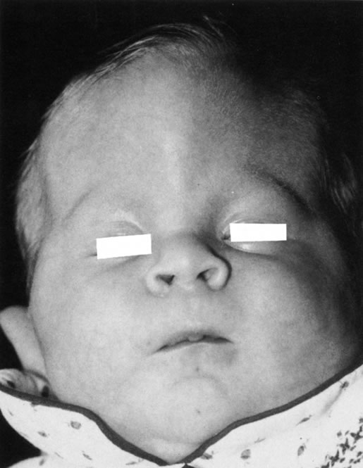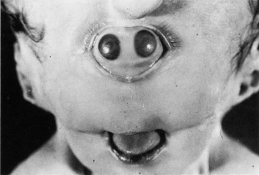 Fibrous dysplasia is not a true neoplasm; however, there is a small incidence of malignant degeneration, usually into osteogenic sarcoma. Treatment options range from careful observation to aggressive debulking of the diseased bone, with subsequent reconstruction. Recent advances in craniofacial surgery, including cranial bone grafting with mini- and microplate fixation, have made the latter approach more appealing. ANENCEPHALY Anencephaly, either partial or total absence of the brain, is a severe congenital birth defect incompatible with life. This dramatic deformity results from a failure of forebrain development. The vault of the skull is absent, and the forebrain consists of a degenerated mass of glial tissue. The orbits are shallow and tilted upward. The eyes are fairly well developed, but the optic nerves, when present, taper down to a loose mass of glial tissue at the optic canal. CYCLOPIA/SYNOPHTHALMOS True cyclopia is a rare congenital anomaly characterized by a single eye situated in a single median orbit. Synophthalmos, which is also rare but much more common than true cyclopia, occurs when paired ocular structures are found in a single median orbit (Fig. 19). These disorders result from a failure of lateralization of the midline facial structures. |