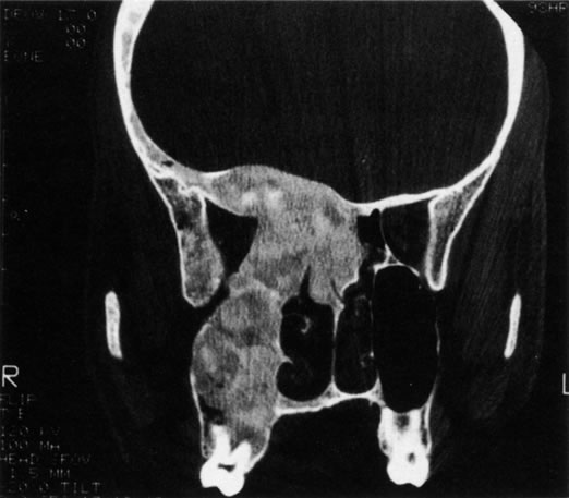 FIBROUS DYSPLASIA Fibrous dysplasia is a benign disorder characterized by an arrest of bone maturation that results in immature bone and osteoid in a cellular fibrous matrix. This congenital disease usually becomes clinically apparent in children and young adults. Fibrous dysplasia can extensively involve the facial bones and skull.24 The maxillary, frontal, and sphenoid bones are most commonly involved. Maxillary bone involvement can cause nasolacrimal duct obstruction. Involvement of the frontal and sphenoid bones may result in orbital asymmetry from contour deformities, vertical dystopia, and exophthalmos (Fig. 17). Radiographically, fibrous dysplasia appears as an expansile bone lesion with a characteristic ground-glass appearance (Fig. 18). Additional ocular complications include compressive optic neuropathy, oculomotor nerve palsy, and trigeminal neuralgia.25 Involvement of the sphenoid bone may result in narrowing of the optic canal, with secondary compressive optic neuropathy. Definitive treatment entails unroofing the optic canal by way of a transcranial approach, although high-dose steroids can be used as a temporizing measure.