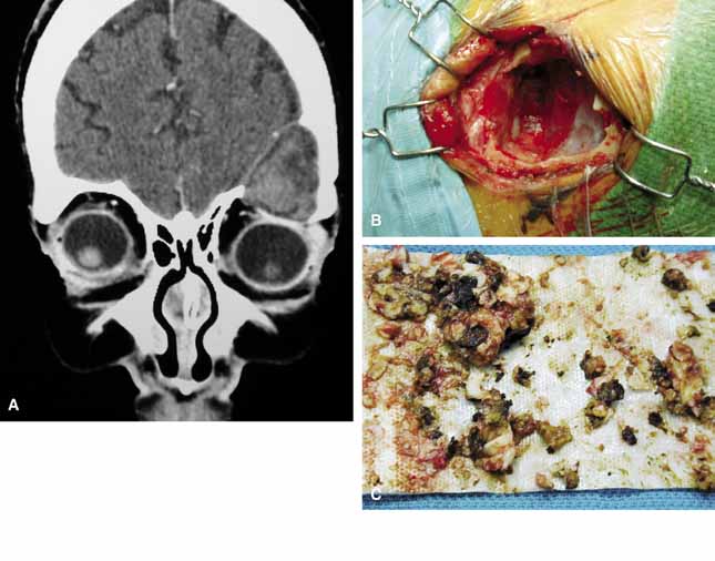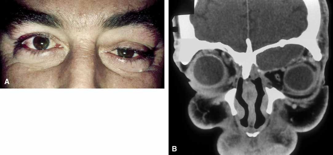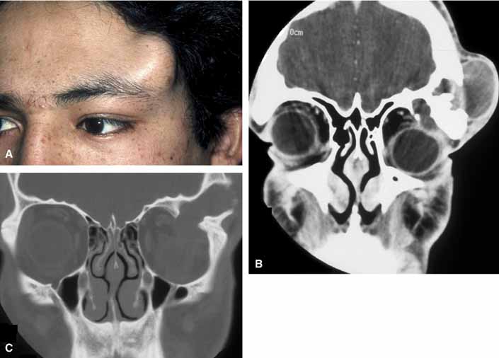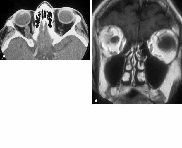 previous sinus surgery. Mucoceles of the frontal and ethmoid sinuses are most common; and their clinical features are usually related to a mass effect and inflammation.33–34 The enlargement of the mucocele may be insidious, with proptosis and displacement of the globe being manifest in association with a palpable, smooth-walled mass in the upper inner quadrant of the orbit (Fig. 8). Mucoceles of the posterior orbit may present more insidiously, with the patient having vague complaints of headache and orbital discomfort. These mucoceles arise in the sphenoid sinus and posterior ethmoid air cells and may mimic retrobulbar neuritis or cause ophthalmoplegia and ptosis by affecting branches of cranial nerve III. Axial proptosis is observed, in contrast to the global displacement in the horizontal or vertical plane associated with anterior mucocele of the frontal sinus. Radiographic analysis, including CT, serves to delineate the origin and extent of the mucocele. Thinning of the overlying bone because of progressive expansion of the mucocele is apparent. Intracranial extension can be observed in untreated mucocele. The treatment of mucoceles is surgical. Frontal and frontoethmoidal mucoceles are often approached subperiosteally with elevation of an osteoplastic flap and eradication and extirpation of all diseased mucosa. Successful sinus obliteration and/or reestablishing sinus drainage intranasally protect against recurrence. Sphenoid sinus mucoceles are approached intranasally. Neurosurgical consultation is indicated for those mucoceles with intracranial extension. |