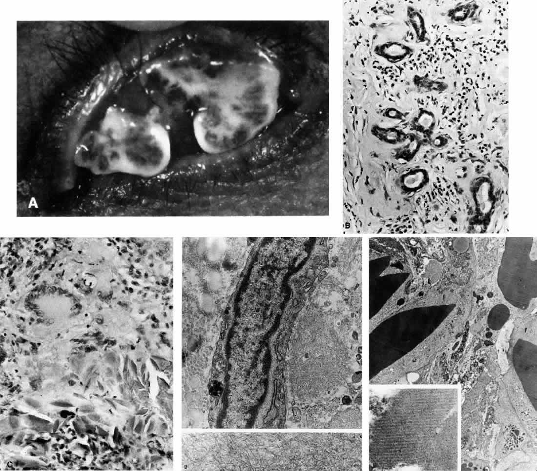 NONSUPPURATIVE NODULAR PANNICULITIS (WEBER-CHRISTIAN DISEASE) Nonsuppurative nodular panniculitis is characterized by nodular inflammation of subcutaneous fat associated with relapsing fevers, generalized weakness, arthritis, and myalgias.284–286 It is more common in middle-aged females, and lesions occur most commonly in the lower extremities. Corneal ulcers, exophthalmos, subconjunctival nodules, episcleritis, and uveitis may be associated with this disease process.287 Heparin has been used to treat the inflammatory intraocular manifestations of this condition. Laboratory Findings Laboratory features include an elevated sedimentation rate, anemia, leukopenia, and hypocomplementemia. During times of active symptomatology often there will be evidence of circulating 7S IgM or immune complexes. Death occasionally occurs due to hemorrhage and severe inflammation, with involvement of the heart, mesenteric fat, and viscera. Other diseases, including erythema nodosum, systemic lupus erythematosus, hypergammaglobulinemia, acute myelogenous leukemia, rheumatoid arthritis, sarcoidosis, and acalculous cholecystitis, may occur in patients with nonsuppurative nodular panniculitis. Intensive anti-inflammatory and antineoplastic therapy is necessary to manage this disease. Histopathology Histopathologically there is evidence of an acute inflammatory response in the fat associated with vasculitis, necrosis, and fat atrophy. Lipid-laden macrophages are common. There may be considerable fibrosis present due to recurrent inflammation. Diagnosis of this condition is based on its multifocality associated with a decreased lipoprotein lipase level. Diabetes, dermatomyositis, pancreatitis, rheumatoid arthritis, and high levels of bromide and iodide may be associated with fat atrophy. These entities usually are not associated with involvement of the orbital fat. Localized inflammation of the orbit as well as a lipogranulomatous response occurs with rupture of an orbital dermoid. However, the absence of systemic symptoms differentiates this from nonsuppurative nodular panniculitis. |