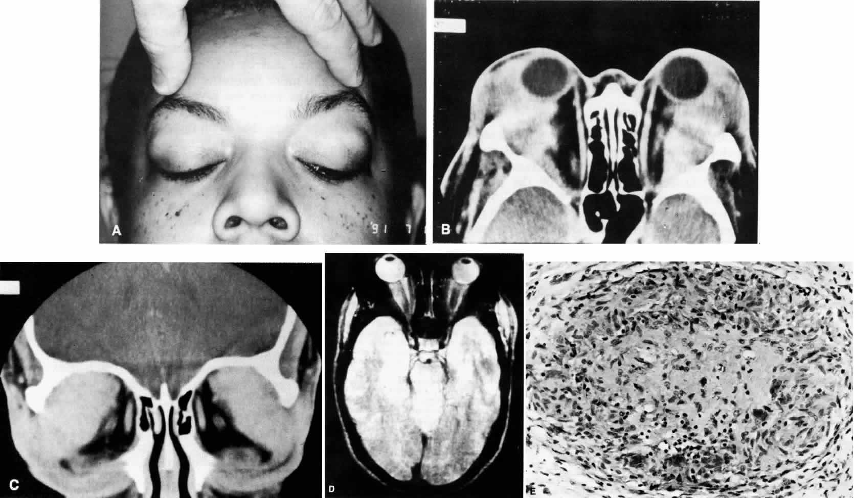 The inflammatory processes that are the subject of this chapter are for the most part immunogenic and, in general, are idiopathic.3–5 The primary exception to this is reactive orbital inflammation secondary to a retained foreign body, nonresorbing blood products, a ruptured dermoid cyst, amyloid deposition, sinusitis, and giant cell reparative granuloma. However, these represent a very small proportion of orbital inflammatory lesions. Of the idiopathic causes of localized orbital inflammation, inflammatory orbital “pseudotumor” comprises the largest group of nonthyroid noninfectious orbital disease and may constitute between 5% and 8% of all orbital lesions.3,4 A separate group of primarily idiopathic inflammatory orbital disease are those associated with systemic manifestations.3 Many of these are vasculitic, in particular, those associated with collagen vascular diseases and necrotizing granulomatous processes such as Wegener's granulomatosis and idiopathic midline destructive disease. Most of the remaining fall into a group of granulomatous processes of which sarcoidosis is by far the most common. Orbital inflammation manifests itself in a variety of ways depending on the acuteness of the disease process. Orbital cellulitis and idiopathic inflammatory “pseudotumor” are most often associated with acute symptomatology, while sarcoidosis demonstrates a more chronic pattern of symptoms. In acute inflammation, symptoms develop over several hours to days. There is usually pain, proptosis, periorbital edema, tenseness, erythema, and conjunctival injection and chemosis. Eyelid ptosis is present secondary to edema. The extraocular motility may be compromised because of either orbital swelling or direct involvement of the extraocular muscle. Visual acuity may be reduced owing to corneal exposure and drying or involvement of the optic nerve through either inflammation or pressure by the surrounding orbital structures. Intraocular inflammation including both uveitis and vitreitis as well as retinal detachment and papillitis may also be present. Patients may also demonstrate malaise and lassitude. In addition to infectious processes and idiopathic inflammation, aggressive neoplastic diseases such as rhabdomyosarcoma, chloroma, and metastatic tumors as well as acute hemorrhage into a lymphangioma must also be considered in the differential diagnosis of these findings. Symptoms and findings associated with subacute inflammation make up the vast majority of manifestations associated with orbital inflammatory disease.3–7 These types of symptoms are usually seen in thyroid-related orbitopathy but are also found in idiopathic orbital inflammation, especially myositis and dacryoadenitis, Wegener's granulomatosis and other vasculitic processes, chronic infections (particularly those associated with fungi and parasites), and primary or secondary orbital malignancies. In general, subacute processes either may slowly progress over several weeks or months or may have a course that undergoes cycles of progression and remission while worsening. Pain may be present but is usually not as severe as that seen in acute inflammation and may be remitting. As with acute inflammatory processes, proptosis, motility disturbances, edema, and injection of the eyelids and conjunctiva are all seen in patients with subacute inflammation. Visual loss and optic disc edema may occur secondary to optic nerve involvement. Chronic inflammatory orbital disease is usually not associated with significant symptomatology early in its course although, over the course of the disease process, proptosis, extraocular motility disturbances, and edema of the eyelids and conjunctiva will occur.3–7 Pain is not usually a feature of chronic inflammation but may occur in sclerosing forms of orbital inflammation. Underlying these findings is a chronic infiltration of the orbital tissues or simply a slowly progressive mass effect. Sarcoidosis, lymphoproliferative and neoplastic processes, thyroid-related orbitopathy, collagen vascular disease, amyloidosis, and reactive granulomatous processes (e.g., cholesterol granuloma and ruptured dermoid cyst) should all be considered in the differential diagnosis. |