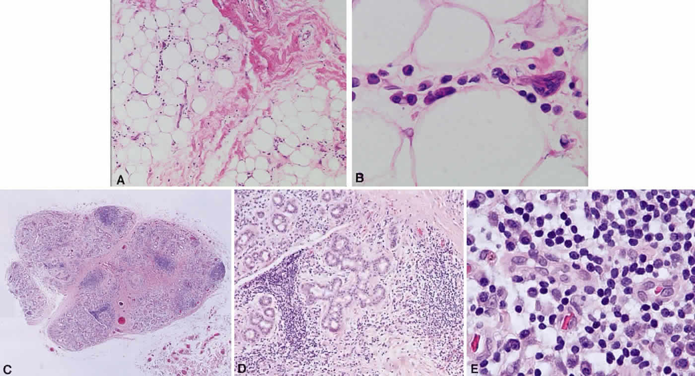 NECROBIOTIC XANTHOGRANULOMA Necrobiotic xanthogranuloma presents in older persons in association with plasma cell dyscrasia and monoclonal gammopathies, and work-up requires serum protein electrophoresis to identify any underlying etiology.204,205 The granulomas consist of histiocytes, Touton giant cells, and xanthoma cells. What distinguishes the lesion histologically from ErdheimChester or juvenile xanthogranuloma is the necrotic focus of these granulomas. They present in subcutaneous skin, including the periocular region, as waxy, erythematous, and indurated lesions, and patients may have hepatosplenomegaly, leukopenia, and an increased erythrocyte sedimentation rate. Treatment of systemic involvement with chemotherapy generally also causes regression of cutaneous and orbital lesions. PALISADING NECROBIOTIC GRANULOMA Palisading necrobiotic granulomas are idiopathic subcutaneous necrobiotic granulomas that resemble rheumatoid nodules but occur in otherwise healthy patients. They can occur in the periocular skin at the orbital margin and medial canthal region but also have been reported in the orbit206–208 (Fig. 31). Histologically, they are composed of palisading granulomas of histiocytes with rare multinucleated giant cells around an area of necrosis and fibrosis (Fig. 32). There may be associated infiltrates of lymphocytes and plasma cells. The granulomas require only superficial excision, since there are no systemic manifestations. Differential diagnosis includes necrobiosis lipoidica, which is associated with diabetes mellitus, or foreign-body necrobiotic granuloma secondary to traumatic foreign body or illicit drug use. SINUS HISTIOCYTOSIS WITH MASSIVE LYMPHADENOPATHY (ROSAI-DORFMAN DISEASE) Sinus histiocytosis with massive lymphadenopathy is a benign condition that causes massive, bilateral, painless cervical lymphadenopathy associated with fever, leukocytosis, elevated erythrocyte sedimentation rate, and hypergammaglobulinemia. It occurs most commonly in African and Asian children.209,210 The mediastinal, inguinal, iliac, and paraaortic nodes also may become involved, but the most common extranodal site of involvement is the orbit, which may be unilateral or bilateral.211–213 The liver, spleen, and bone marrow usually are spared. Lymph nodes become replaced by histiocytes, and, similarly, the lids or orbit are infiltrated by populations of histiocytes, which have abundant cytoplasm and engulfed lymphocytes or erythrocytes, a phenomenon referred to as emperipolesis or erythrophagocytosis (Fig. 33). The sheets of histiocytes may be separated by areas of lymphocytes in a follicular structure. The histiocytes do not contain Langerhans' granules, which differentiates this disease from the eosinophilic granuloma. Prognosis is excellent because viscera generally are spared, and the disease usually resolves spontaneously in 2 to 3 years, with chemotherapy or radiation therapy being ineffective. |