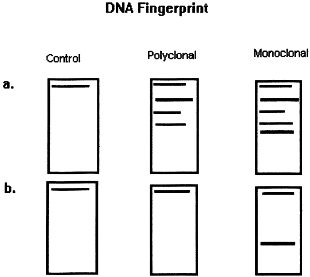 GENETICS OF LYMPHOMA Lymphomas are thought to occur as the result of an immunoregulatory defect, caused by somatic mutations resulting either in loss of a tumor suppressor gene or in the upregulation of a protooncogene or factor regulating mitosis and differentiation of naive lymphocytes to memory cells and plasma cells. As a result, patients who are immunosuppressed because of congenital immunodeficiencies, autoimmune diseases, cytotoxic agents after organ transplantation, or acquired immunodeficiency syndrome are thought to be at increased risk of developing nonHodgkin's lymphomas, and, in patients with acquired immunodeficiency syndrome in particular, lymphomas tend to be more aggressive with bone marrow, bowel, and central nervous system involvement and are associated with a poor prognosis despite treatment.7–12 Immunoglobulins have been studied at the molecular level in lymphoma. Monoclonal lymphoid lesions express gene rearrangements that can be detected with restriction endonuclease cleavage and Southern blot.13–25 The gene rearrangement appears as a unique band on the blot, known as a DNA fingerprint, and a polyclonal lesion, which expresses the immunoglobulins made by several different lymphocyte populations in undetectable amounts, then would demonstrate only the control band (Fig. 3). Many cytogenetic abnormalities that are characteristic of certain lymphoma subtypes have been isolated, mostly in the form of chromosomal translocations, some of which have been recognized to cause upregulation of protooncogenes, upregulation of transcription factors, and downregulation of factors involved in apoptosis. Chromosomal translocations are thought to occur so frequently in lymphoma because they take place during the normal process of B-cell differentiation. Examples of mutations and the affected gene include the c-myc oncogene (8q24) in Burkitt's Lymphoma, the bcl-1 gene (11q13) in mantle cell lymphoma, the bcl-2 (18q21) in follicular lymphoma, the bcl-2 t(14;18) gene in 70% to 90% of follicular lymphomas and 10% to 35% of nodal large cell lymphomas, the bcl-6 gene (3q27) in diffuse large cell lymphoma, and the PAX-5 gene t(9;14)(p13;q32) identified in 50% of lymphoplasmacytoid lymphomas25–37 (Table 2). The genes that are overexpressed or underexpressed, as a result of the mutations or translocations, have begun to be elucidated. The bcl-2 gene is a regulator of normal cell apoptosis.34 The t(14:18) translocation of bcl-2 is thought to allow unregulated cell longevity of the centrocytes in follicular lymphoma. The c-myc gene is known to code for a protooncogene, which, when upregulated, allows for unmitigated cell division.26,27 The PAX-5 gene belongs to a family of PAX genes, which have been identified as critical regulators of the cell cycle and differentiation.27,31,35 In particular, PAX-5 (BSAP) codes for the B-cell-specific transcription factor expressed in all stages of B-cell differentiation except in plasma cells.35 BSAP factor is suspected of enhancing B-cell lymphopoiesis, but the exact mechanism is not known. A mutation in bcl-1 allows for upregulation of the PRAD-1 gene, which codes for cyclin D1, a cell cycle regulator.26,27