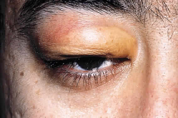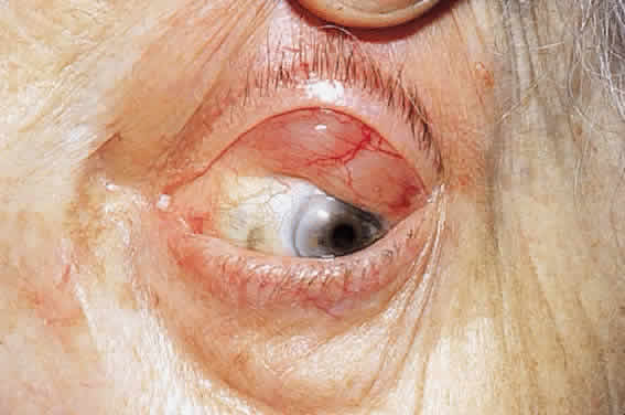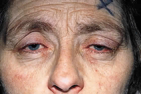 Multifocal Langerhans' cell histiocytosis may be more aggressive clinically compared with unifocal and require systemic chemotherapy to control progression. The lesions are otherwise similar to unifocal disease, although younger patients tend to have multifocal involvement. Under the age of 2 years, the syndrome of multifocal lesions with cutaneous, visceral, lymph node, and, rarely, ophthalmic disease has been termed Letterer-Siwe disease, and these patients typically have fever with localized infection, otitis media, and maculopapular, eczematous, or purpuric skin lesions. There may be hepatosplenomegaly, severe bone marrow involvement resulting in anemia, thrombocytopenia, and leukopenia, and cystic lesions of the skull, pelvis, and long bones. The course is commonly fulminant and fatal, with few spontaneous remissions despite therapy. Hand-Schüller-Christian disease is characterized by the rare but classic triad of lytic skull lesions, proptosis, and diabetes insipidus and usually occurs in children in the first few years of life. The osteolytic lesions may be secondary to release of osteoclast-activating factor released by macrophage-activated lymphocytes. Bone lesions actually predict a better outcome, and the natural history of the multifocal granulomas carries a favorable prognosis even without treatment. JUVENILE XANTHOGRANULOMA Juvenile xanthogranuloma is a benign histiocytic disease that occurs in children and resolves spontaneously before adulthood in most cases. The most serious ophthalmic complication of juvenile xanthogranuloma is glaucoma from a spontaneous hyphema secondary to a lesion in the iris. The skin and the eye are commonly involved, and the orbit and viscera, only rarely.194–198 Half of the orbital xanthogranulomas involve the extraocular muscles. The skin lesions present as multiple reddish yellow elevated round lesions, and in one fifth of cases, the lesions are present at birth and disappear in 2 to 4 years. Histologically, the lesion is composed of the multinucleated Touton giant cell with surrounding lymphocytes and plasma cells (Fig. 29). The Touton cell contains multiple nuclei that surround an inner core of eosinophilic cytoplasm and, peripheral to the nuclei, there is a foamy and vacuolated cytoplasm. The histiocytes are devoid of Langerhans' granules, and unlike the eosinophilic granulomas, which show epidermotropism, these lesions are located in the dermis. Juvenile xanthogranuloma responds well to steroids and radiation. It has been reported in patients with neurofibromatosis and Niemann-Pick disease, and scrutiny for these underlying diseases is warranted.199–202 ERDHEIM-CHESTER Erdheim-Chester is a systemic xanthogranulomatosis. The presence of indurated xanthelasmas, as opposed to the usual velvety lid xanthelasmas, and bilateral proptosis should raise suspicion of this condition (Fig. 30). The lesion consists histologically of xanthomas, which are macrophages that, because a metabolic derangement, cannot release engulfed lipid and are surrounded by Touton giant cells, lymphocytes, plasma cells, and fibrosis. The orbital lesions can cause plaque-like lid xanthelasma, ophthalmoplegia, optic nerve swelling and atrophy, and choroidal folds. Lytic or sclerotic bone lesions can lead to sinus tracts with discharge. Xanthomatous infiltrates can impair cardiac, pulmonary, and renal function. Orbital involvement has been reported only in a handful of cases and often responds to corticosteroid treatment improving extraocular motility and optic nerve function.203